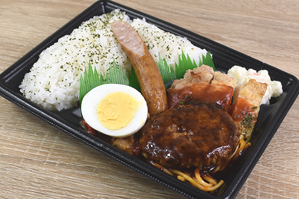 ビッグサイズの容器に入っている同商品。パッケージを開けると、真っ赤なトマトソースから食欲をそそるにんにくの香りが漂ってきます。ラインナップされているおかずは、グリルチキン、ハンバーグ、ウインナー、豚バラ炒め。ゆで卵も“ドンッ”と鎮座しているので、全体的に華やかなカラーリングですね。
