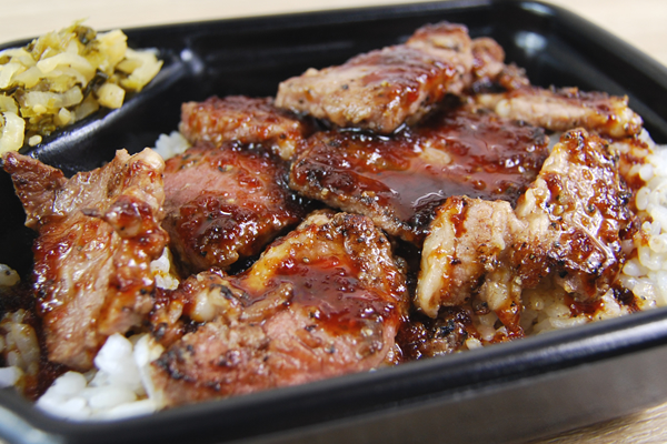 白いご飯の上に牛肉がたっぷりトッピングされている「カットステーキ重」。付属のステーキソースは“たまり醤油”がベースになっており、カリフォルニア産の赤ワインや香味野菜・大根おろしなどを加えています。