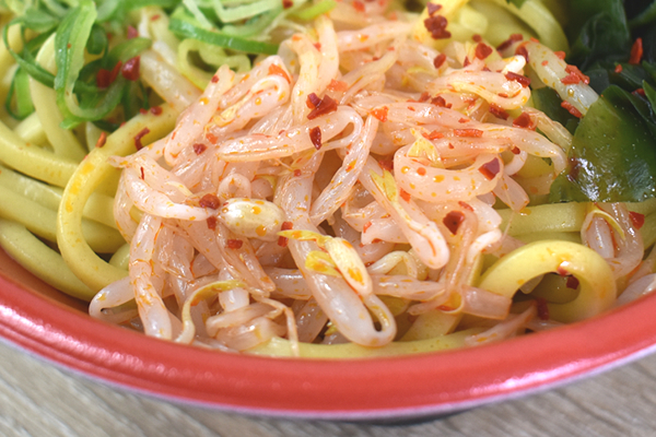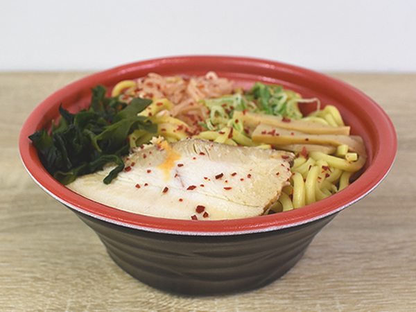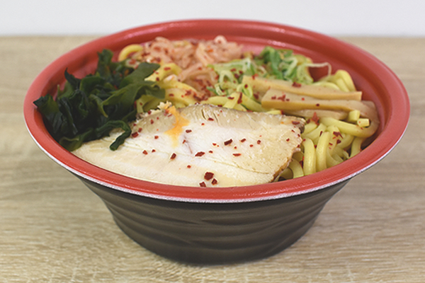 ジャンボサイズの黒いどんぶりに入っている同商品。フタを開けてみると、かつおの匂いが部屋中に立ちこめてきました。太麺の上にトッピングされているのは、青ねぎ・もやし・わかめ・メンマ・厚切りのチャーシュー。粉末状の“赤唐辛子”が振りかけてあるので、ピリッとした刺激と太麺の相性も気になりますね。