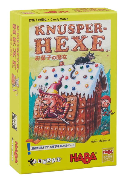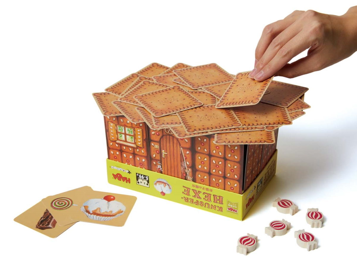 お菓子の家の屋根を崩さないよう、カードを順番に引き抜いていくゲーム。手番ではカードを1枚抜き、1周前に引いたカードと被らなければそのままもらえます。屋根が崩れた時点でカードの枚数が1番多かった人が、キャンディコマを獲得します。