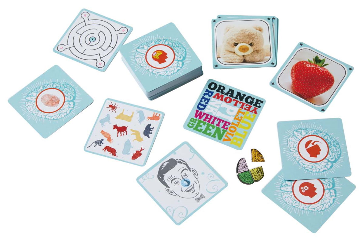 めくったカードに描かれた「指定された指で顔のパーツを触る」「いちばん多い柄を探す」といった8種類の早解き問題に全員一斉に挑戦。わかったらカードをタッチして回答します。ご褒美の4つのブレインピースを早く集めた人が勝利。