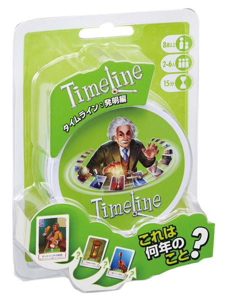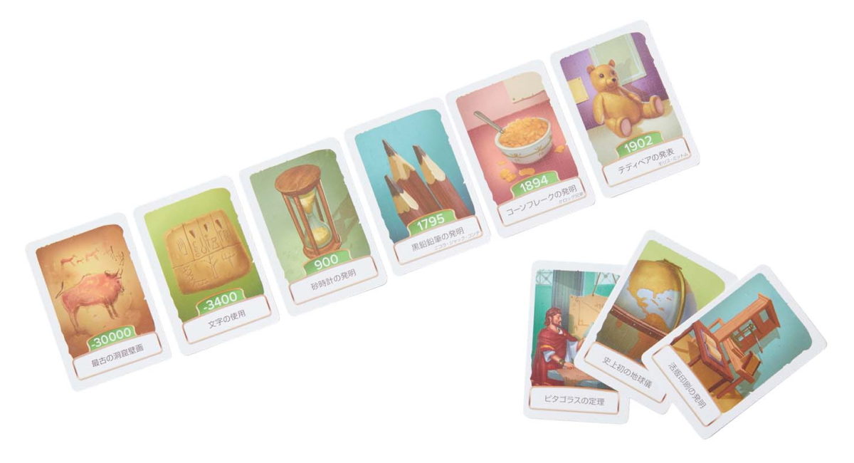 「ブルージーンズ」「歯ブラシ」などの発明品が描かれたカードを、誕生した年代順に正しく並べていくのがゲームの目的。すでに場に出ているカードの年代の前後いずれかに置き、カード裏の年代をチェック。正解ならその場に置けます。