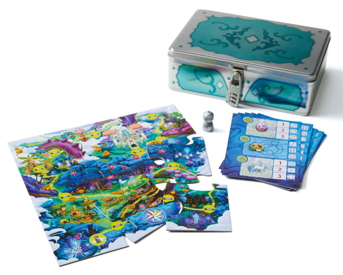 出題者が正解の暗証番号3桁をセットし、宝箱に鍵をかけゲーム開始。他プレイヤーはヒントカードを見ながら、ボード上に隠された情報を頼りに謎を解き明かします。導き出した3つの番号を錠前にセットし、正解なら宝箱がオープンします。