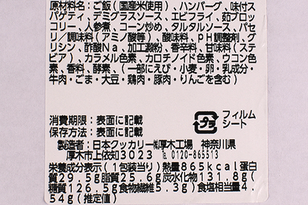 フタを開けると、デミグラスソースの深い香りが一気に広がりました。食欲を刺激する匂いを堪能しつつおかずのラインナップを確認すると、ハンバーグとエビフライの他にブロッコリー、ニンジン、コーン、スパゲティを発見。洋食屋さんでハンバーグを頼んだ時に出てくる、絶対にハズレのないつけ合わせですね。