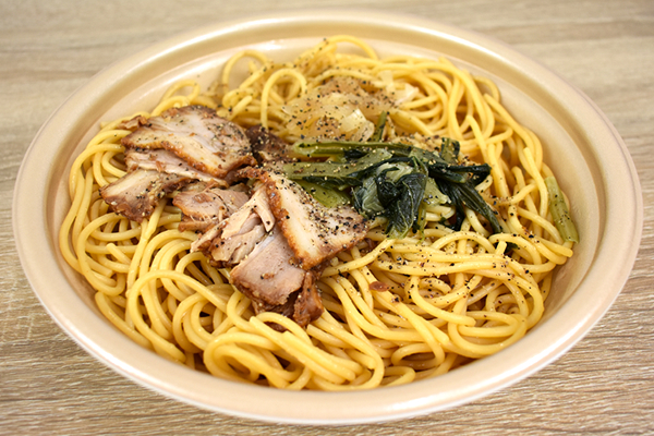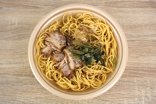 ペペロンチーノといえばにんにくと唐辛子を使った定番オイルパスタですが、同商品の味つけは一味違います。ペペロンチーノソースに“たまり醤油”と“にんにく”の旨味や香りを閉じ込め、和のテイストを演出。パスタによく使われるベーコンではなくチャーシューを使うなど、あまり見慣れない具材が使われているのも特徴です。フタを開けると、強烈なにんにくの匂いに混じって醤油のこうばしい香りが感じられました。