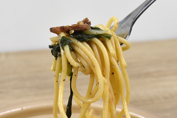麺は食べごたえのある1.9mmの太麺が使われており、もちもちの食感がペペロンチーノソースと相性抜群。にんにく&醤油で太麺とくれば“家系”ラーメンを想像してしまいますが、味つけは意外にマイルドです。がっつり大盛りを食べる時に味が強すぎると、お腹が膨らんできた終盤には飽きてしまいがち。しかし同商品は味のパンチと食べやすさがちょうどいいバランスなので、最後まで飽きることなく食べられました。