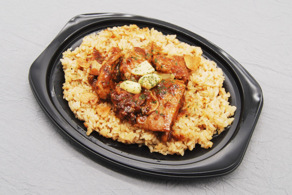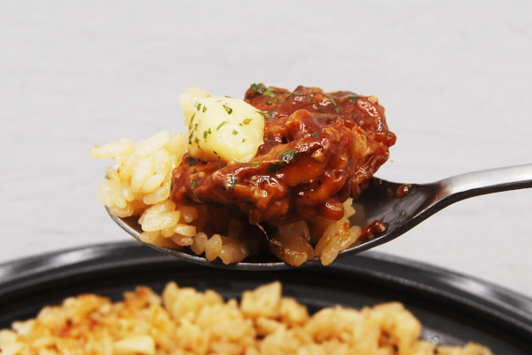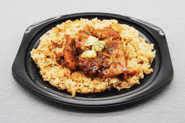 同商品は、にんにくを混ぜた炒飯にガーリックチキンを盛りつけたボリューミーな弁当。丸ごと炒めたにんにくやスライスガーリックがたっぷりとトッピングされ、レンジで温めているうちから強烈なにんにくの香りが食欲を刺激します。フタを開けてみると、パラパラに炒められた炒飯の上にガーリックソースで味つけされたこうばしいチキンが。炒飯にもスペイン産紫にんにくピューレが使われているため、どこを見てもにんにくの使われていない部分が見当たりません。
