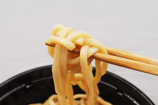 麺に具材をかけると、かなりのボリューム感がある同商品。麺は滑らかなのど越しで、もちもちとした食感が食欲をそそります。太麺タイプでコシがあり、食べごたえも十分。スープの量は少ないため、油そばを食べている感覚です。