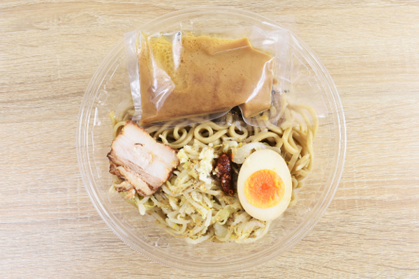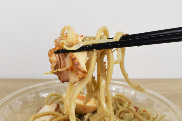 面白いネーミングの同商品は、“ガッツリ”とにんにくを使ったパンチのある冷やしラーメン。パッケージをチェックしてみると、「ニンニク入り豚骨白湯魚介スープ」や「もやしキャベツ 煮干し粉掛け」などの材料名が記載されていました。中でも、気になったのは「ワシワシ食べる 全粒粉入り太麺」という記述。それでは、実際に“ワシワシ食べる”を体験してみたいと思います。