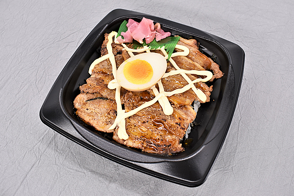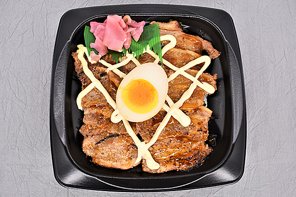 大盛りの白米の上にところ狭しと敷き詰められた豚肉が印象的な同商品。豚バラ肉の上にはマヨネーズがかかっており、ゆで卵や漬物もトッピングされています。最大の特徴は何といっても特製の“にんにく醤油だれ”で、フタを開けるとすぐににんにくの香りが立ちのぼってきました。