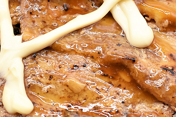 こうばしい香りに食欲を刺激されつつ実食スタート。豚肉と白米を口のなかに入れると、まずはにんにく醤油の濃厚な風味に驚かされます。続いてやってくるのは、マヨネーズソースの酸味。マヨネーズがにんにく醤油の味を程よく中和し、濃い目のタレを飽きのこない味つけに。タレの絡んだ豚肉と白米のコンビネーションは最高ですよ。