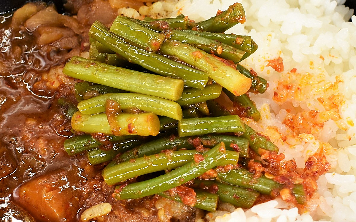 それでは、ニンニクの芽を食べてパワーチャージしていきましょう。ルーと一緒に味見してみたところ、刺激的な風味が口の中を襲撃。ニンニクの芽はシャキシャキ感がしっかりと残っており、咀嚼するたびにこうばしい香りが鼻の中を抜けていきます。