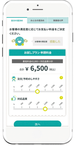 商品やサービスを体験したあとに、利用者自身が価格を決めて支払う国内初のサービス。価格は専用の画面で直感的に決められる。昨年8月よりサービスを開始し、現在10社以上の企業が導入。