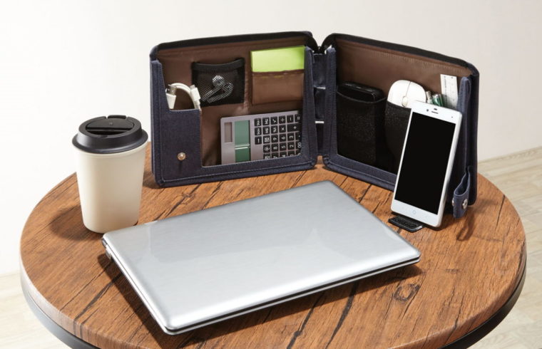テレワーク環境で必要な小物類を分類収納できるバッグ。中身をしっかりホールドできる伸縮素材のポケットを備えており、安心して持ち運べる。L字型に自立するため、狭い場所でも広げられる。
