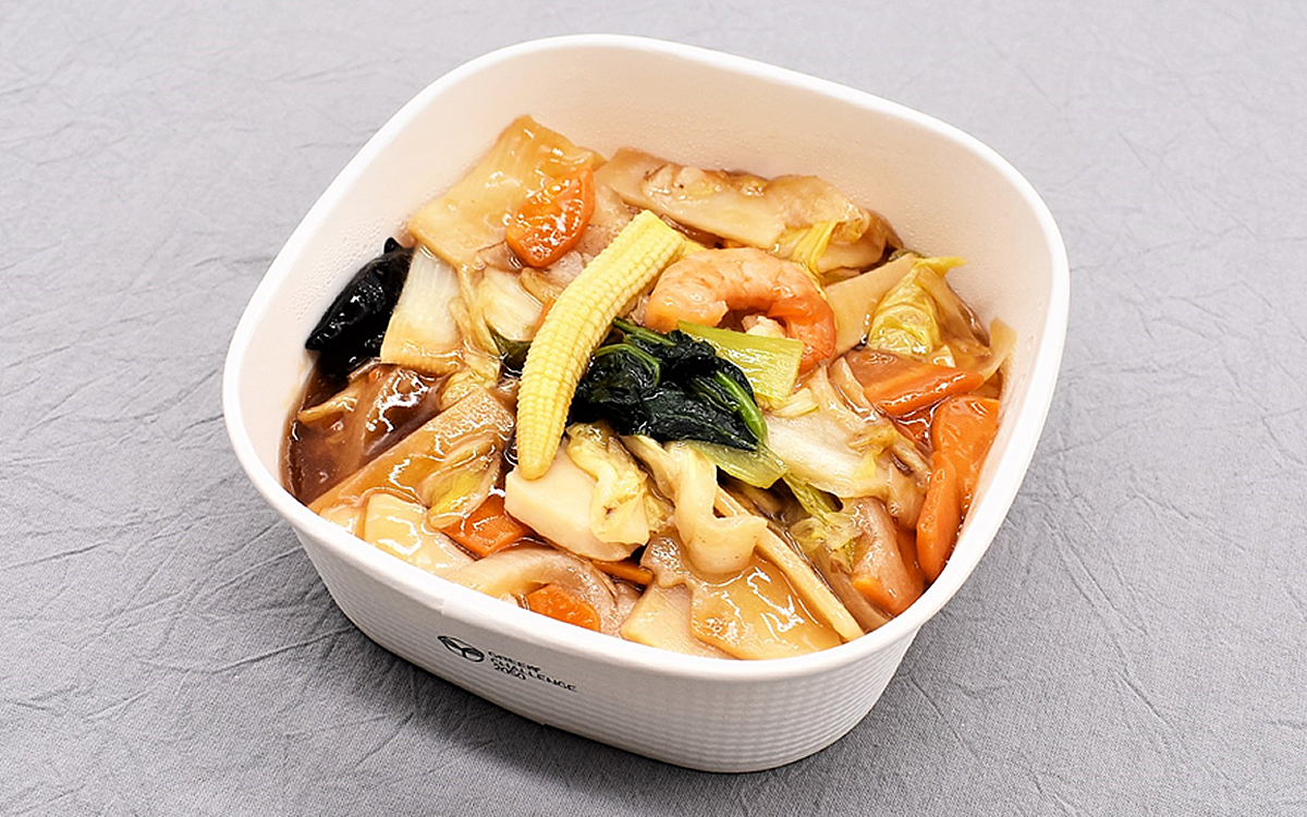 同商品に入っている野菜は白菜、玉ねぎ、タケノコ、ニンジン、ヤングコーン、小松菜、キクラゲなど。そこにエビ、イカといった海鮮食材がトッピングされています。色とりどりの具材を楽しめるだけではなく、見た目も華やかなのがうれしいですね。