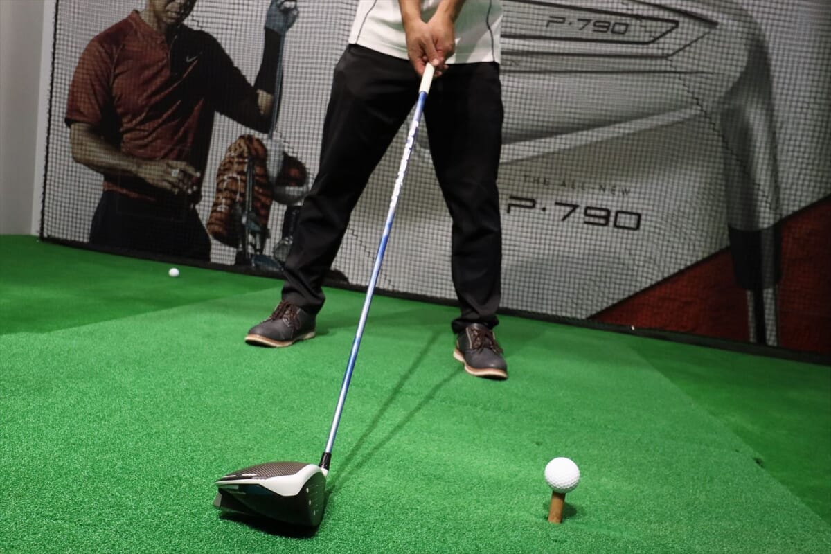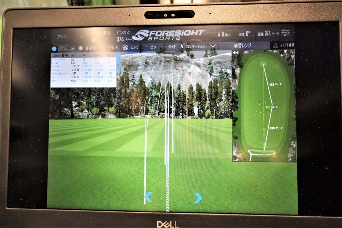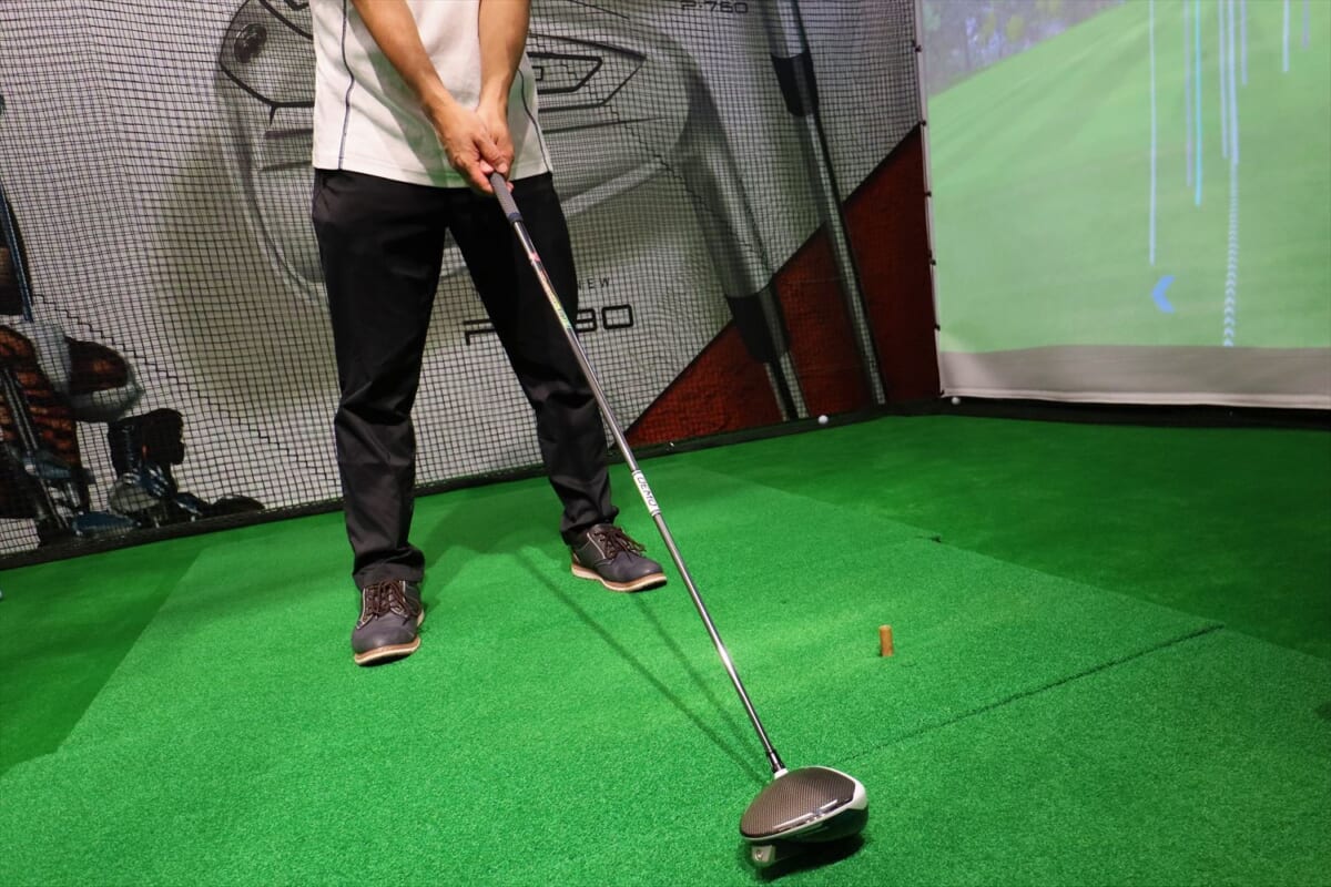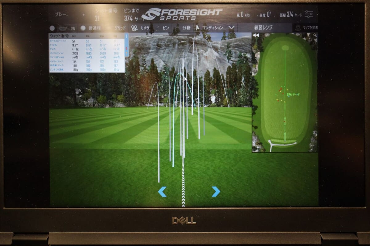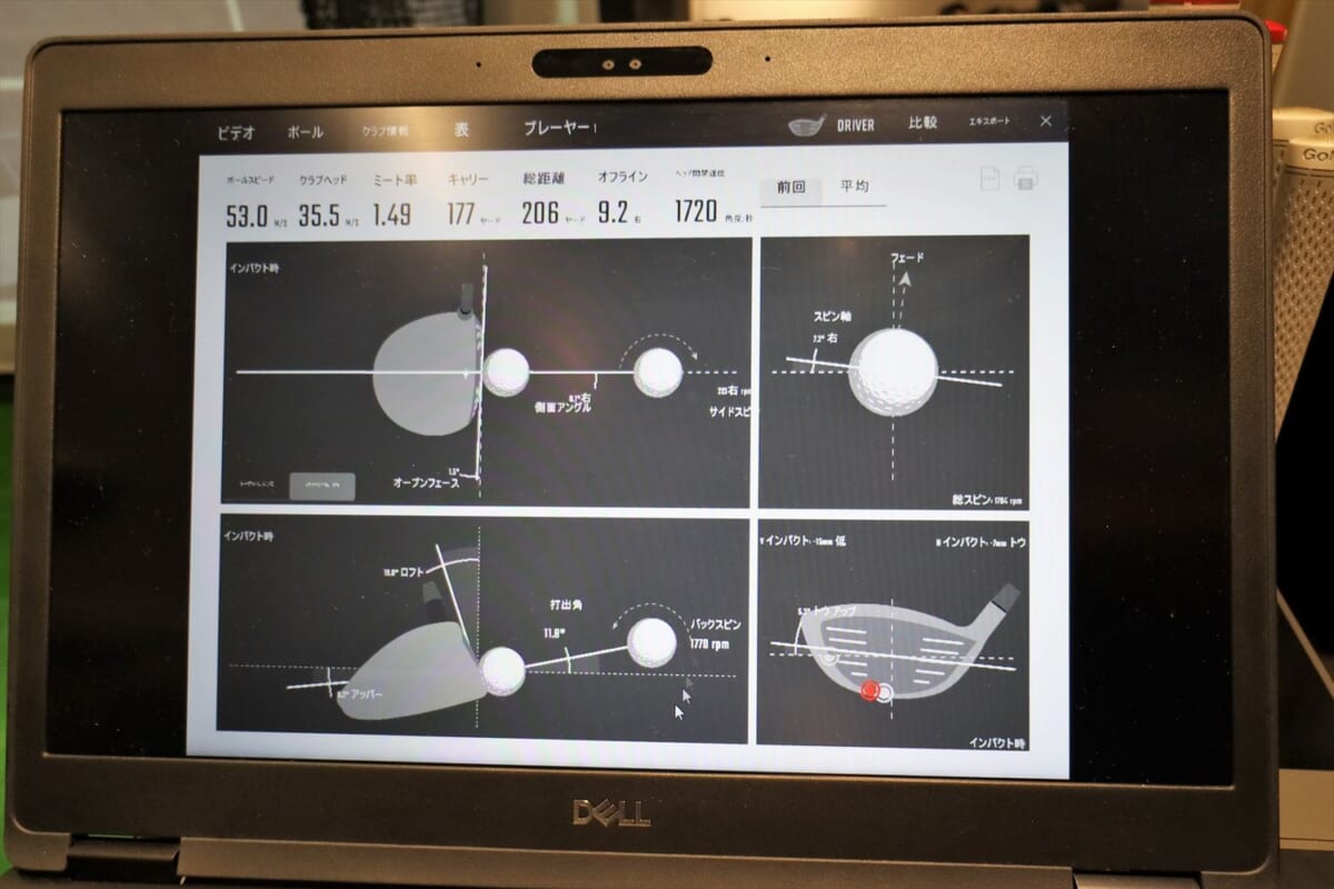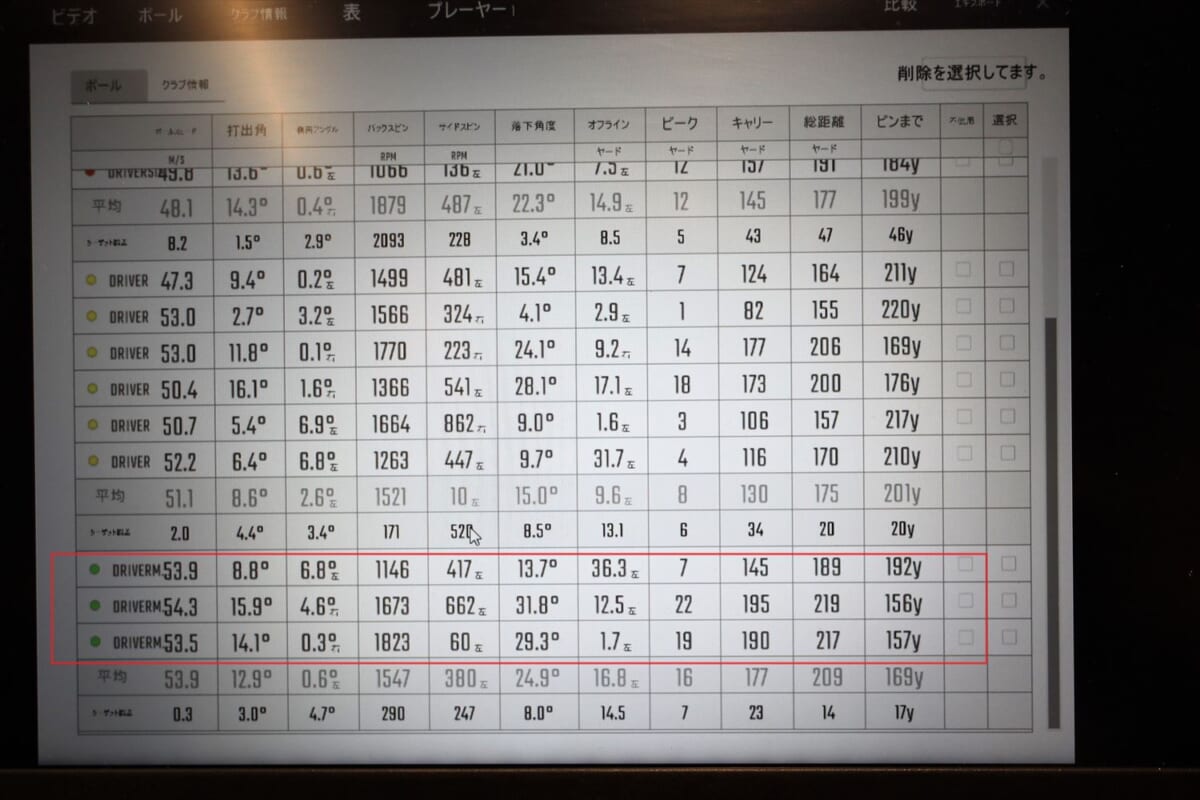 次は三菱ケミカルのディアマナ。ブラックボディにレインボーロゴが強そう! でも、これもちょっと硬い。そして突然、右に飛んでしまう。「オリジナルがつかまりすぎて左に飛んでしまいスピードが乗らない人には、ディアマナのようなヘッドが返りづらいシャフトがおすすめなのですが、硬すぎるようですね」(阿部さん)。筆者のひ弱なスイングではヘッドを返すことができず右に行ってしまうようです。