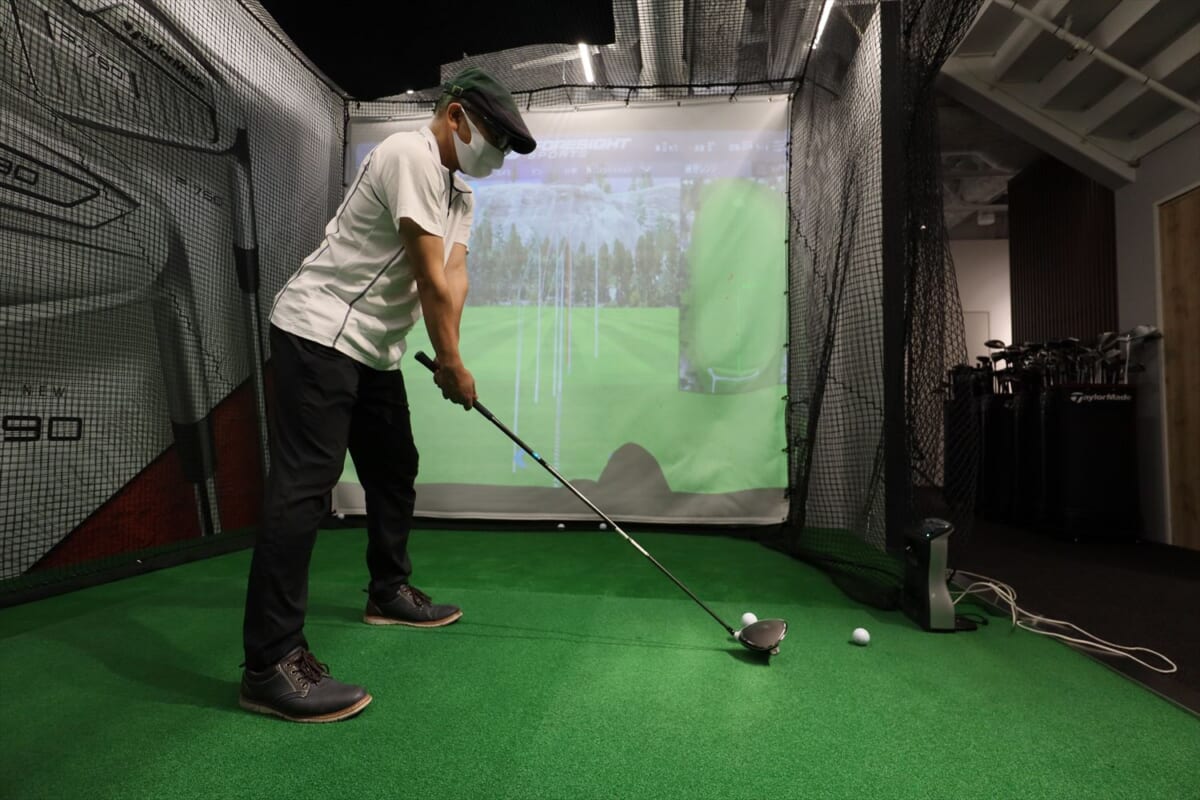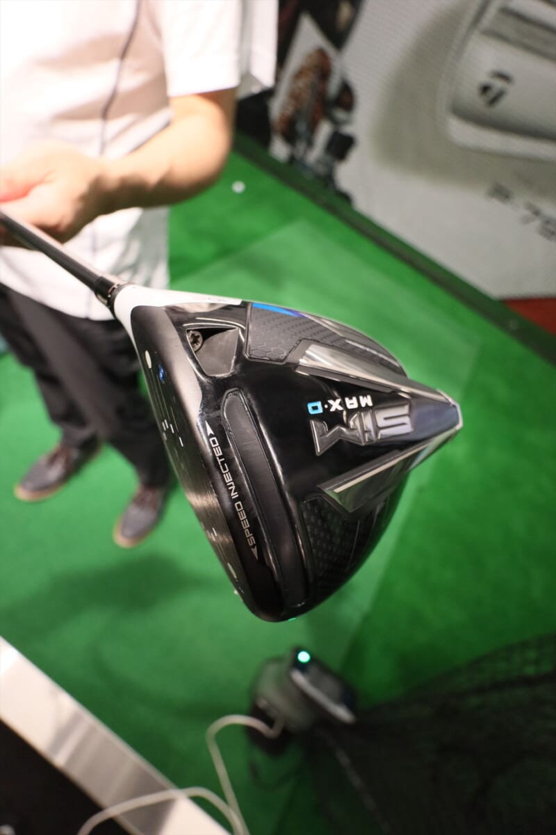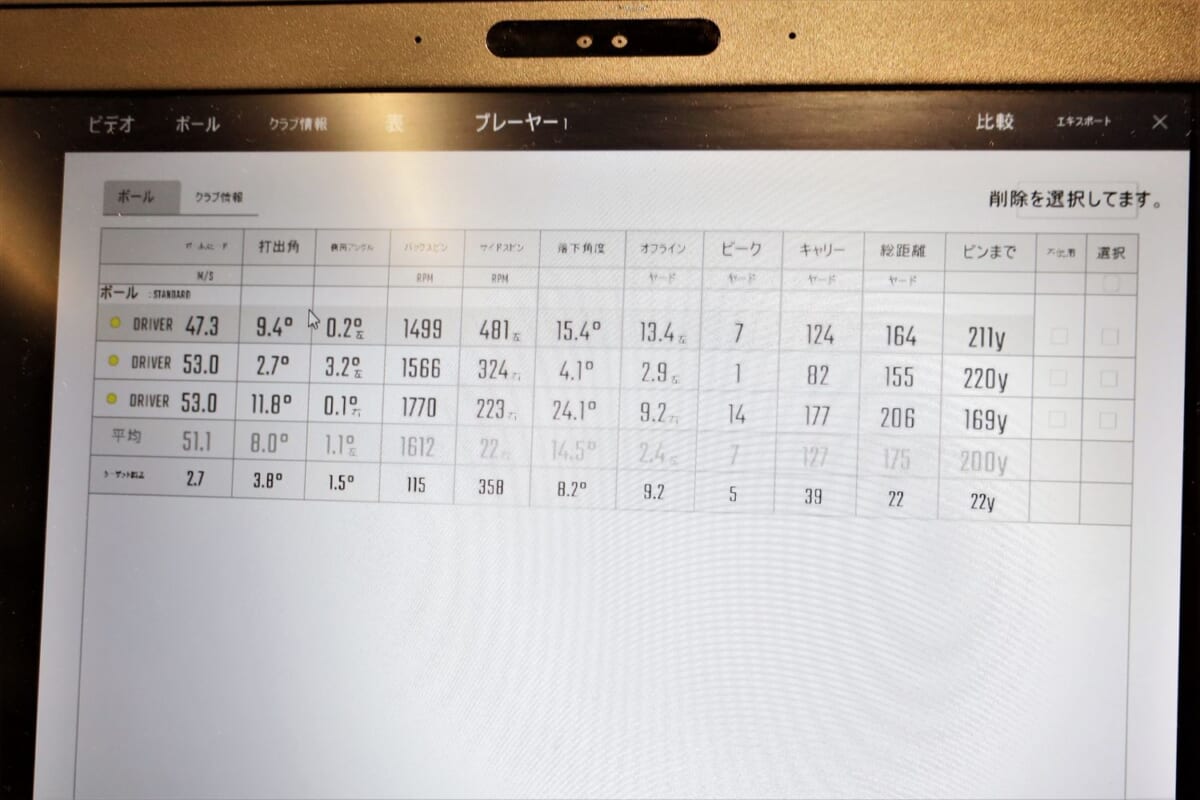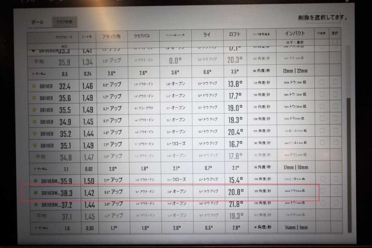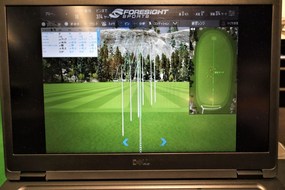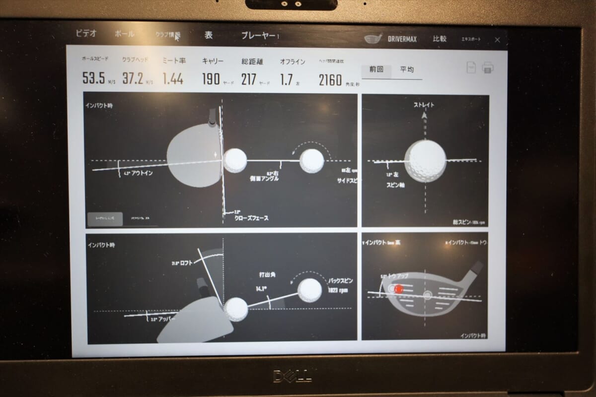 次は三菱ケミカルのディアマナ。ブラックボディにレインボーロゴが強そう! でも、これもちょっと硬い。そして突然、右に飛んでしまう。「オリジナルがつかまりすぎて左に飛んでしまいスピードが乗らない人には、ディアマナのようなヘッドが返りづらいシャフトがおすすめなのですが、硬すぎるようですね」(阿部さん)。筆者のひ弱なスイングではヘッドを返すことができず右に行ってしまうようです。