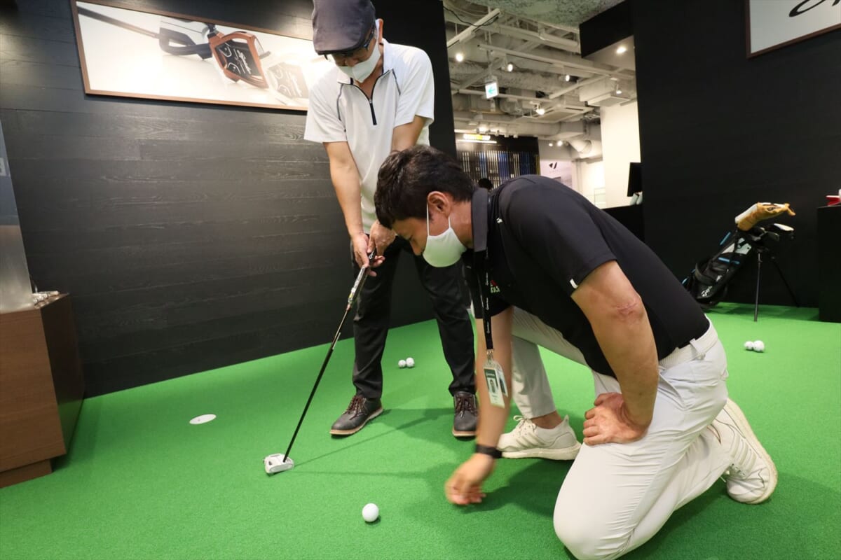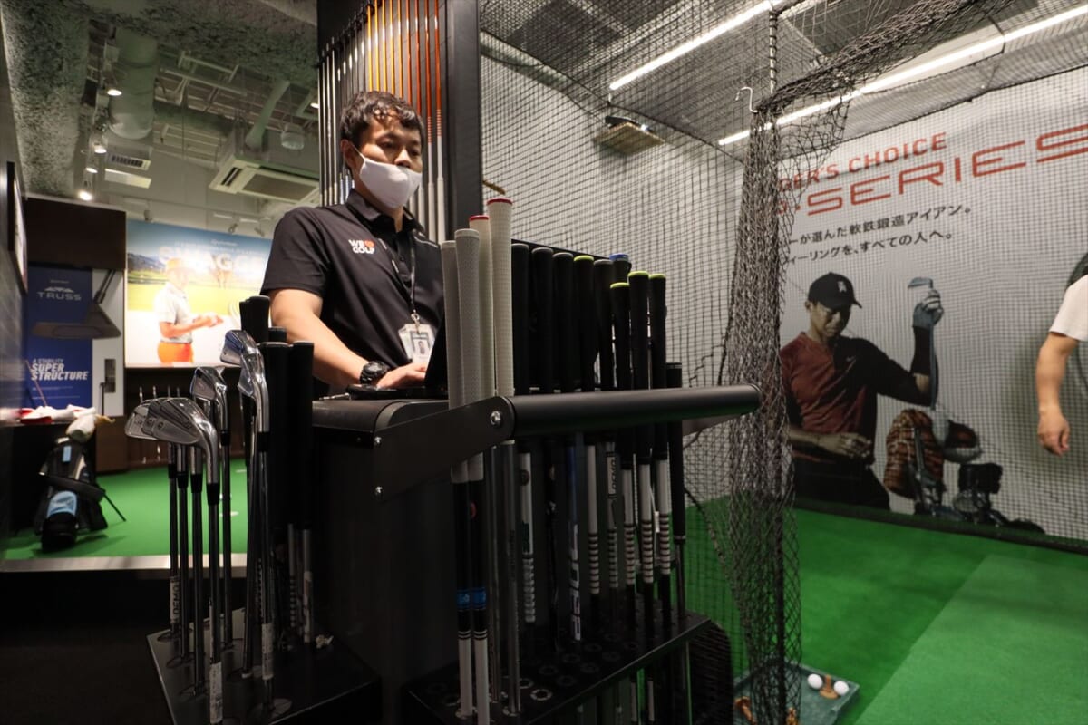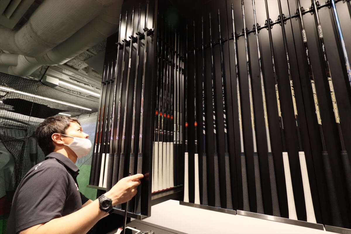 で、こうなるとさらに欲が出ます。もっと飛ぶクラブはないかと。そこで、銀座店にある250本のシャフトラインアップの出番です。「私に合ったシャフトで、見た目がカッコ良くて、もっと飛びそうなやつ」という、なんとも漠然としたリクエストで阿部さんに2本を選んでもらいました。