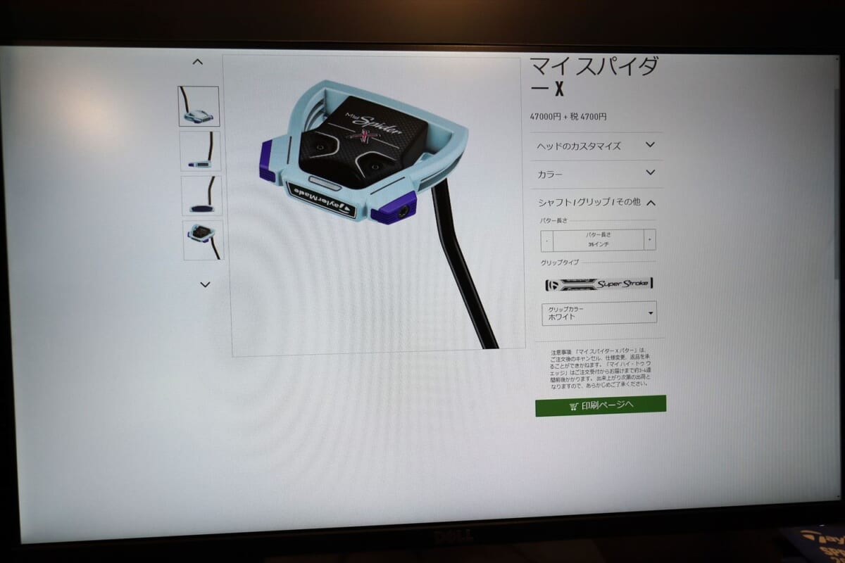 選べるのはネック形状、真っ直ぐ打ち出すためのサイトラインの有無と形状/カラー、そしてヘッド/ウエイト/フェースインサート/テーラーメイドバッジ/スパイダーバッジ/グリップそれぞれのカラー、シャフトの長さ。その組み合わせは実に400億通り。銀座店でカラーサンプルを見ながらパソコンに打ち込むだけでマイスパイダーが注文できます。仕上がりは4週間後とのことです。