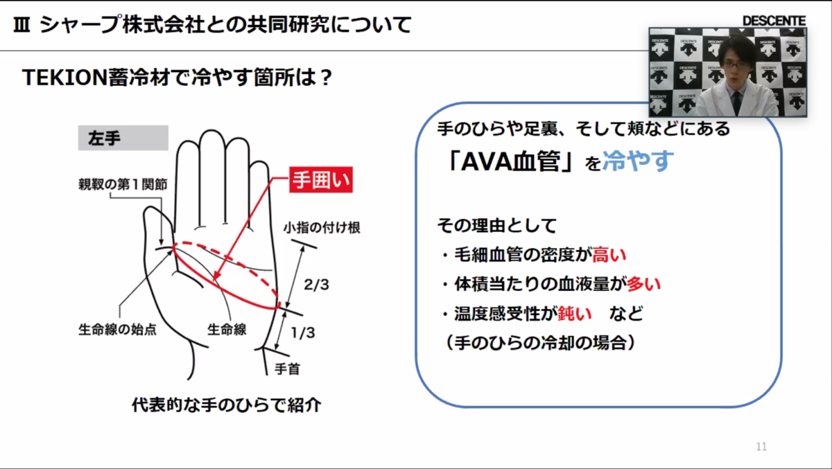 今回発表された、このフェイスガードは、手に装着し、手のひらのAVA血管(※2)を適温で冷やす「CORE COOLER(コアクーラー)」(6月発売)の技術を応用した商品。デサントでは、暑熱対策に有効とされる手段として、手のひら・足の裏・頬などにあるAVA血管を適温の12°Cで冷やすことで、体の深部体温の上昇を抑制する方法に注目しています。