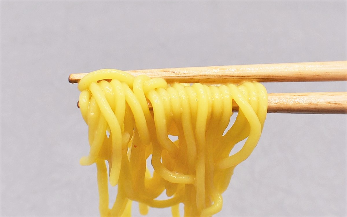 まずは付属のスープを麺の上にかけて実食していきます。スープには味噌だけではなく練りゴマ、ショウガ、ラー油などをプラス。質感はサラサラとしており、スッキリと飲みやすい喉ごしです。ショウガと合わさった味噌の香りがこうばしく、かなり食欲を刺激されました。