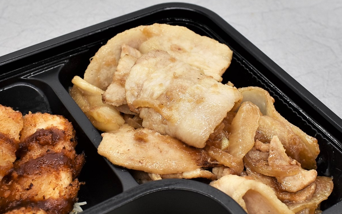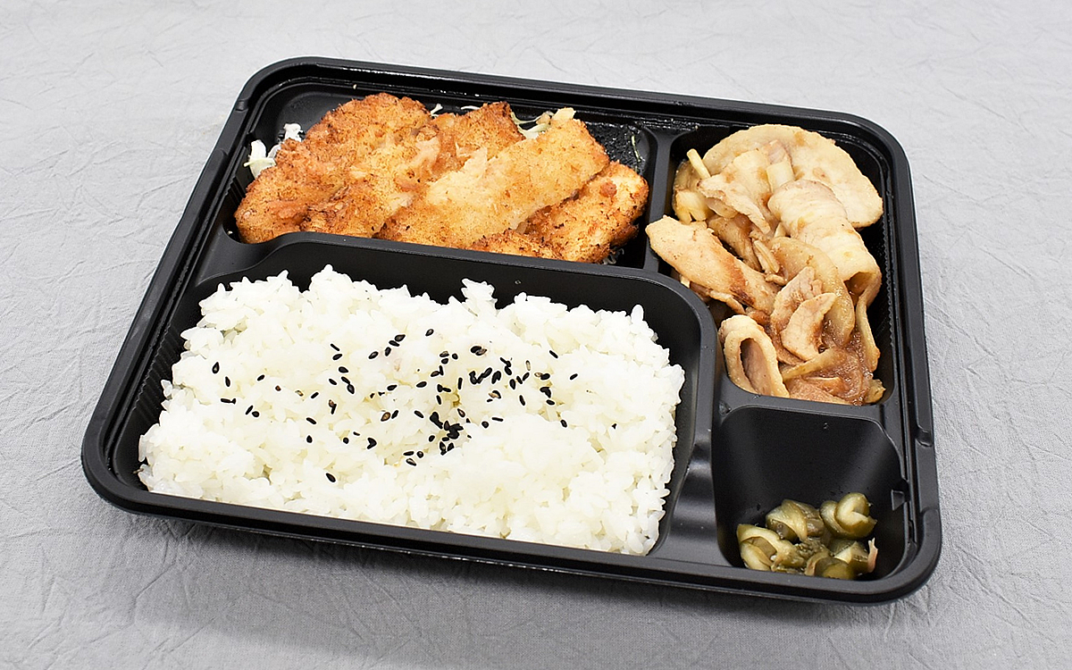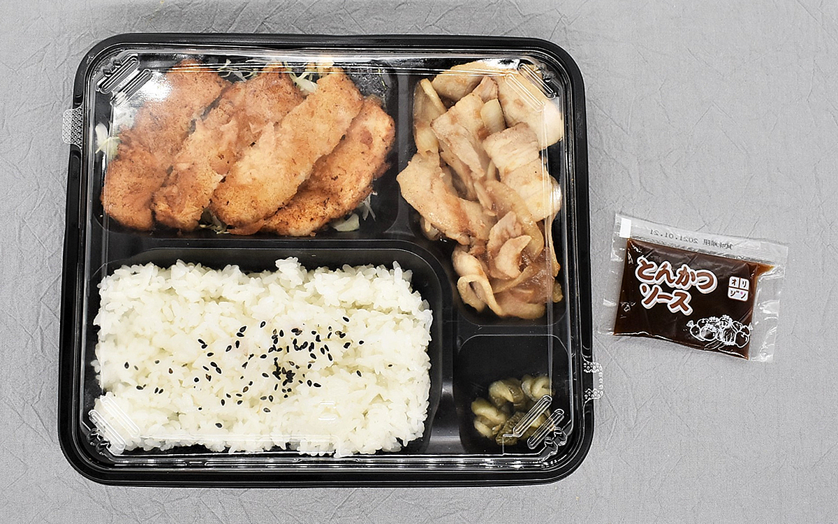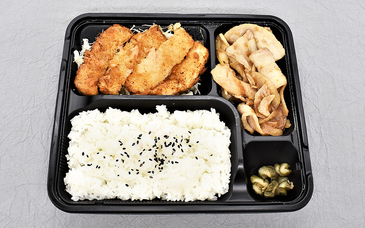 さっそくフタを開けてみると、チーズチキンかつと生姜焼きが豪快に登場。ボリューミーなおかずが2つも入っているだけあって、見た目からなかなかインパクトがあります。