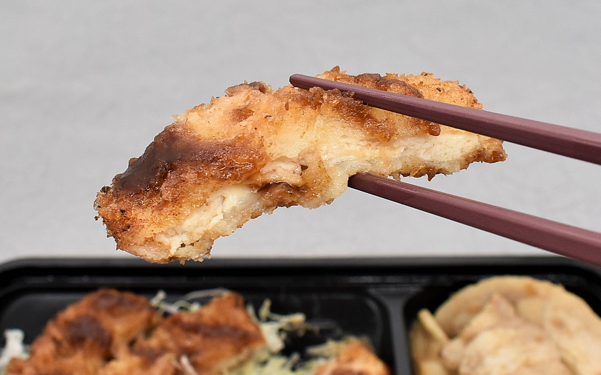 次はお隣のチーズチキンかつへ。付属のソースをかけたら、いざ実食! お弁当のチキンといえばややかたいイメージがありますが、チーズチキンかつはすぐに噛み切れるとっても柔らかいお肉でした。チーズの味は思ったよりも控えめで、ご飯とかつの相性を邪魔しません。