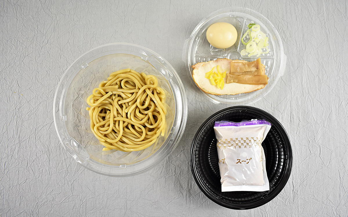 極太の麺を、濃厚なスープとともにいただく同商品。トッピングされているのはチャーシュー、ネギ、メンマ、味つけ卵、ゆず皮とシンプルな具材です。付属の容器に冷たいスープを注いだら、さっそく実食スタート。