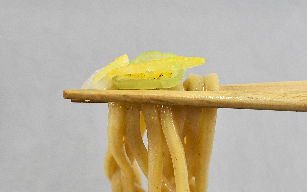 スープの塩気を強く感じたら、ゆず皮と一緒に食べて味変させるのがおススメ。塩気を中和する酸味と香りがプラスされ、さっぱりと食べやすくなりました。