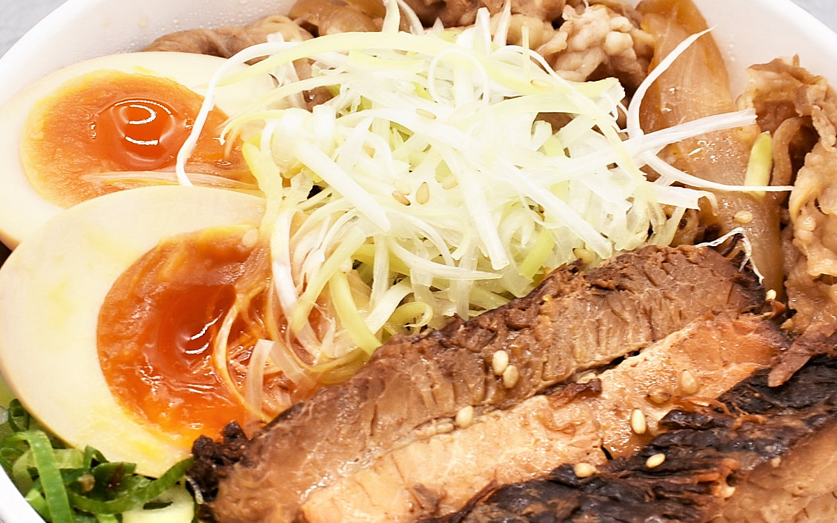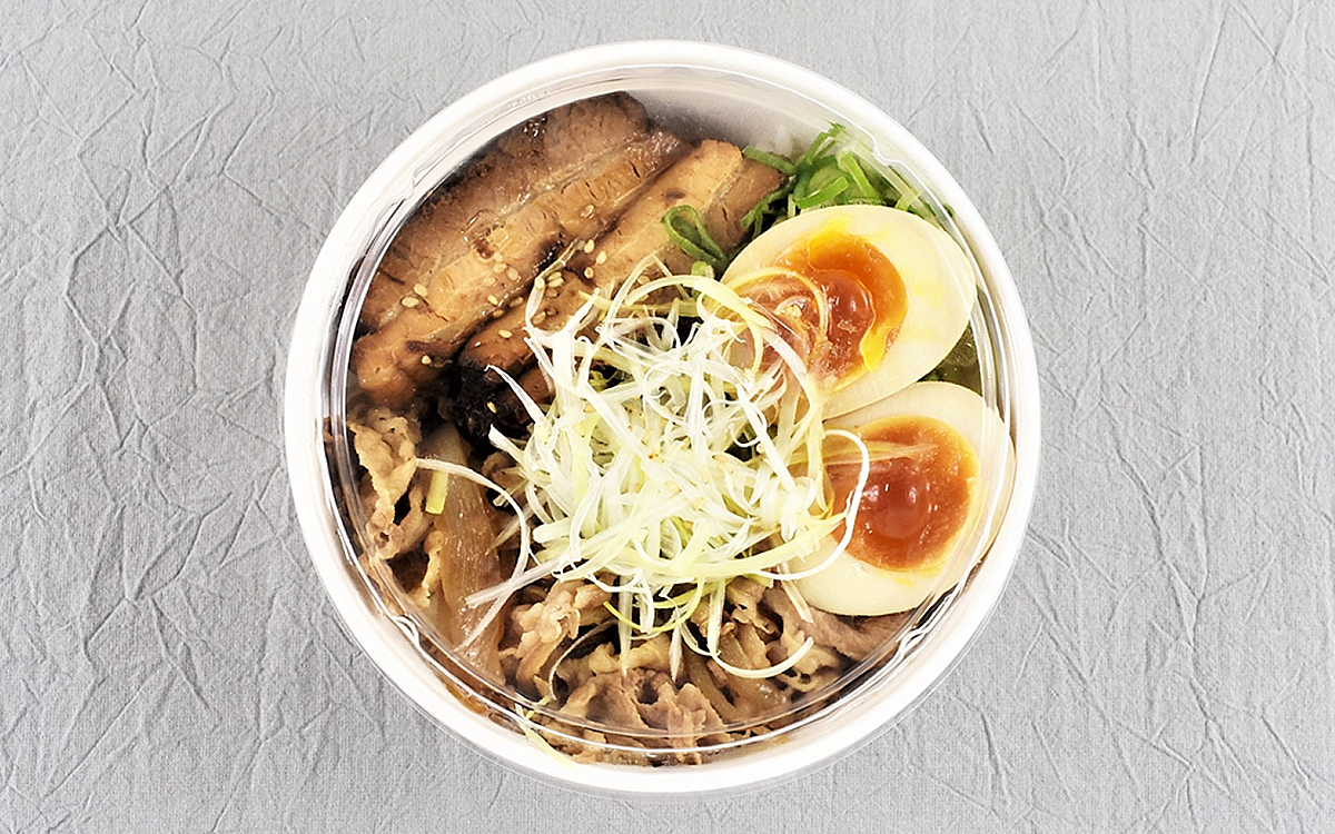 牛肉と角煮がご飯の上に“ドンッ”と鎮座する同商品。2種類のお肉はもちろん、他にもねぎや“特製味付け玉子”がトッピングされています。フタを開けてみたところ、ごまやねぎのこうばしい香りがフワリ……。かなりボリューミーな見た目に仕上がっているので、夏バテ解消にもうってつけですよ。