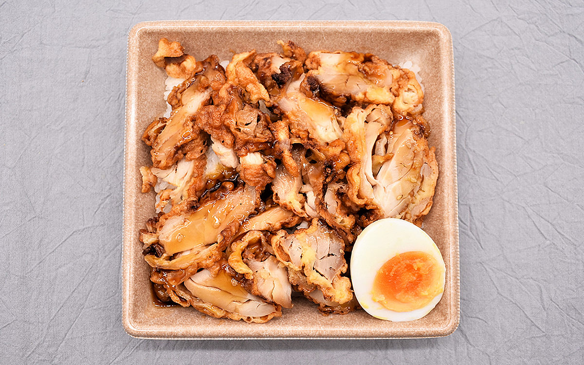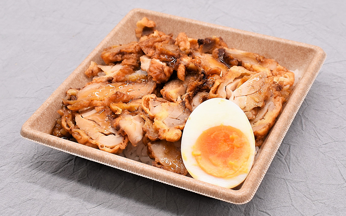 半分にカットされたゆで卵以外、とり肉の唐揚げで全て埋め尽くされている同商品。とり肉たちがぎゅうぎゅうにひしめき合っており、そのビジュアルはまさに“肉肉しい”といった印象です。