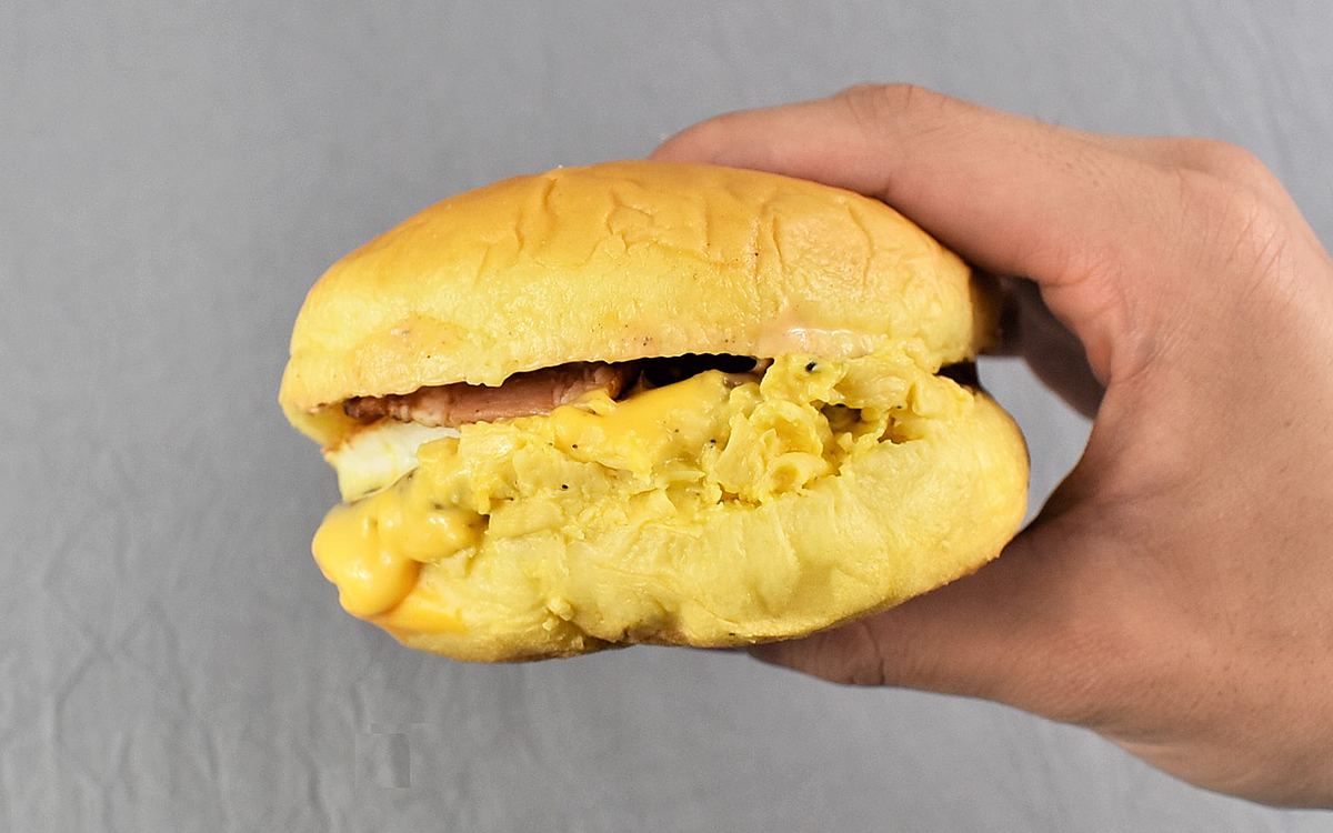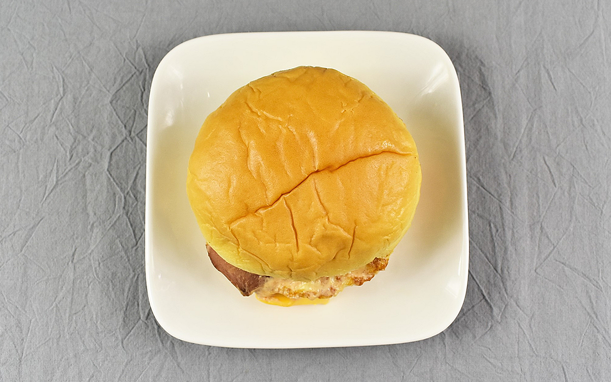 パッケージを開けると、バンズからとろ~りと溢れ出たチェダーチーズがお目見え。チーズとたまごの黄色が鮮やかで、さっそく“お月見気分”を味わえます。ひとくち食べた瞬間に感じたのは、こうばしいバターの香り。“スクランブルエッグ風フィリング”に国産バターが使用されているらしく、コク深い味わいがたまご好きにはたまりません。「月見バーガー」にも入っているぷるぷるの目玉焼きも、もちろん絶品です。2種類のたまごをたった390円で堪能できるなんて、とってもお得!