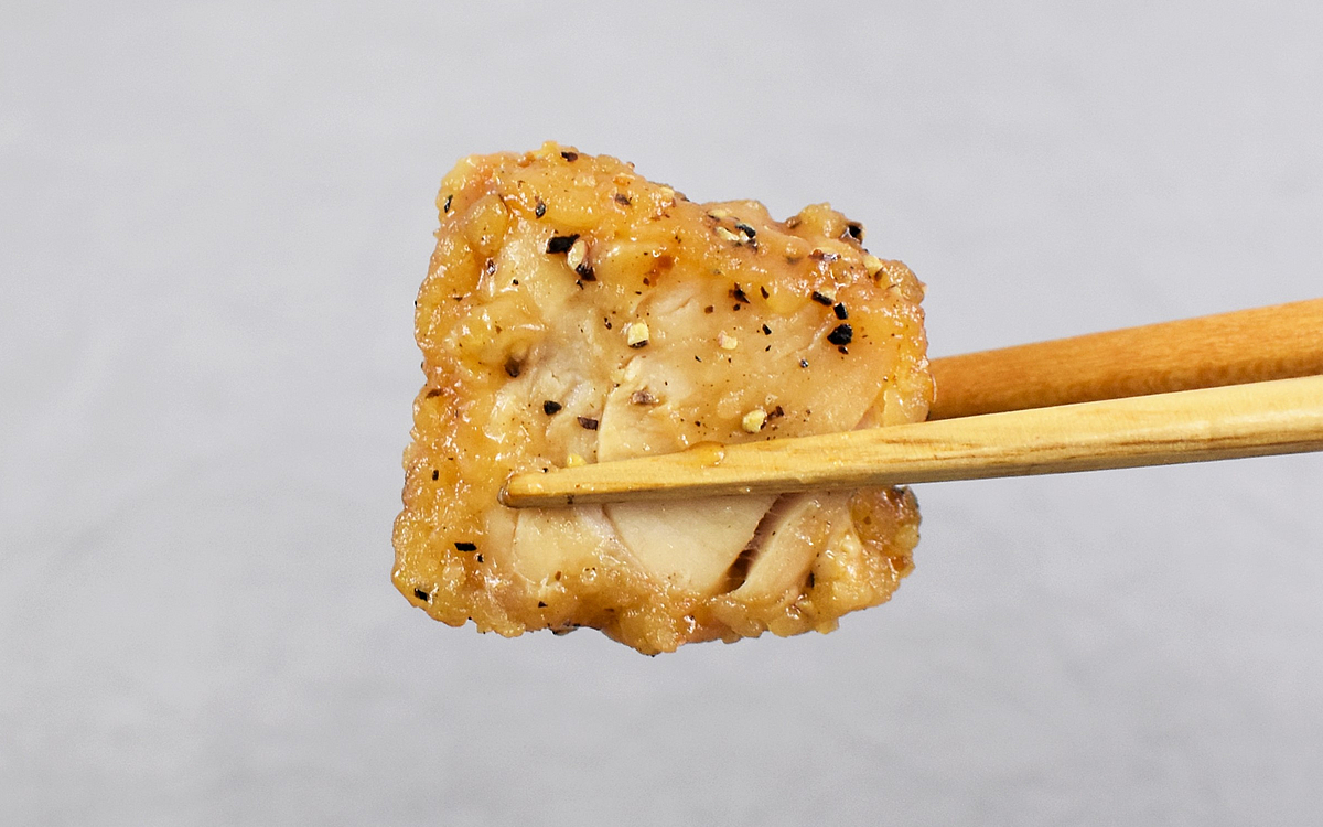 それでは、電子レンジで温めて実食していきましょう。さっそく唐揚を味わってみたところ、痺れるような辛味が口の中を襲撃。とても塩気が効いているおかげで、ホカホカの白米とも相性バツグンです。黒胡椒がとり肉の風味を邪魔しているかと思いきや、咀嚼するたびにジューシーな肉汁を堪能できました。