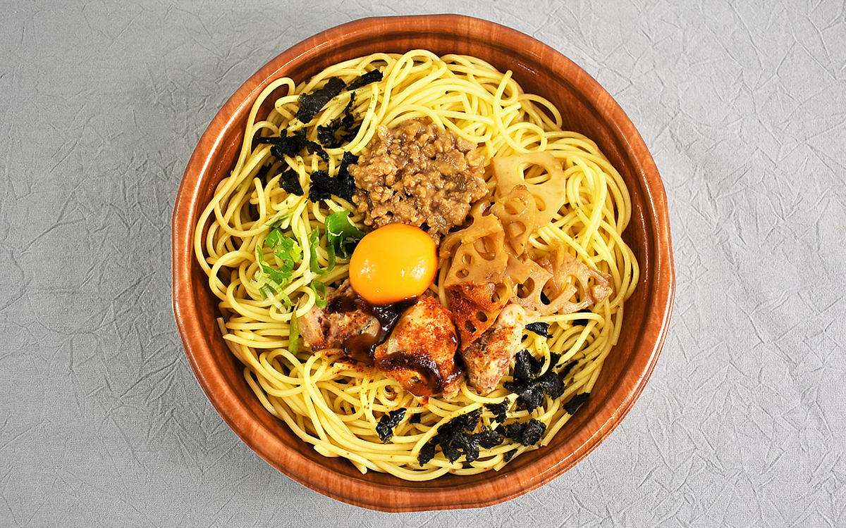 オレンジ色の卵黄に思わず目を奪われる同商品。お皿の真ん中にある卵黄は、まさに空に浮かぶ“月”のように見えます。パスタには他にも焼鳥や鶏そぼろ、れんこんのきんぴら、青ネギなどが入っており、コンビニのパスタでこんなに具沢山な商品があるなんて正直びっくり。ボリュームのある一品なうえ、“中秋の名月”にピッタリの新メニューです。