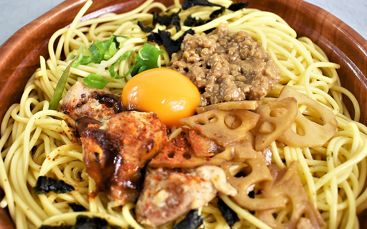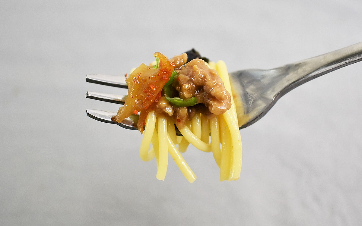 パッケージを開けた瞬間、醤油ベースの出汁の香りが鼻を抜けていきました。こうばしい香りにつられて一口食べてみると、想像以上にスパイシーな味わいが。七味などの香辛料が効いたパスタは、やや刺激的な味つけになっています。そこに卵黄を絡ませればかなりマイルドな口当たりになるので、辛いものが苦手な方にもおススメですよ。
