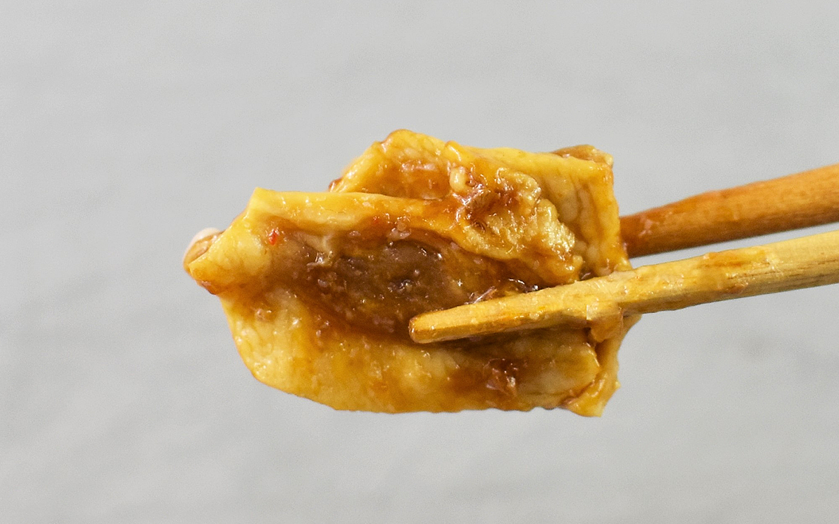 同商品は、醤油を使用した甘辛たれの味つけが特徴。豚肉を一口食べたところ、一瞬にしてたれの旨味が口の中に広がりました。おまけに豚肉は、柔らかくてジューシーな味わいが。噛むたびに肉汁&コクの効いた“たれ”をたっぷり堪能できますよ。