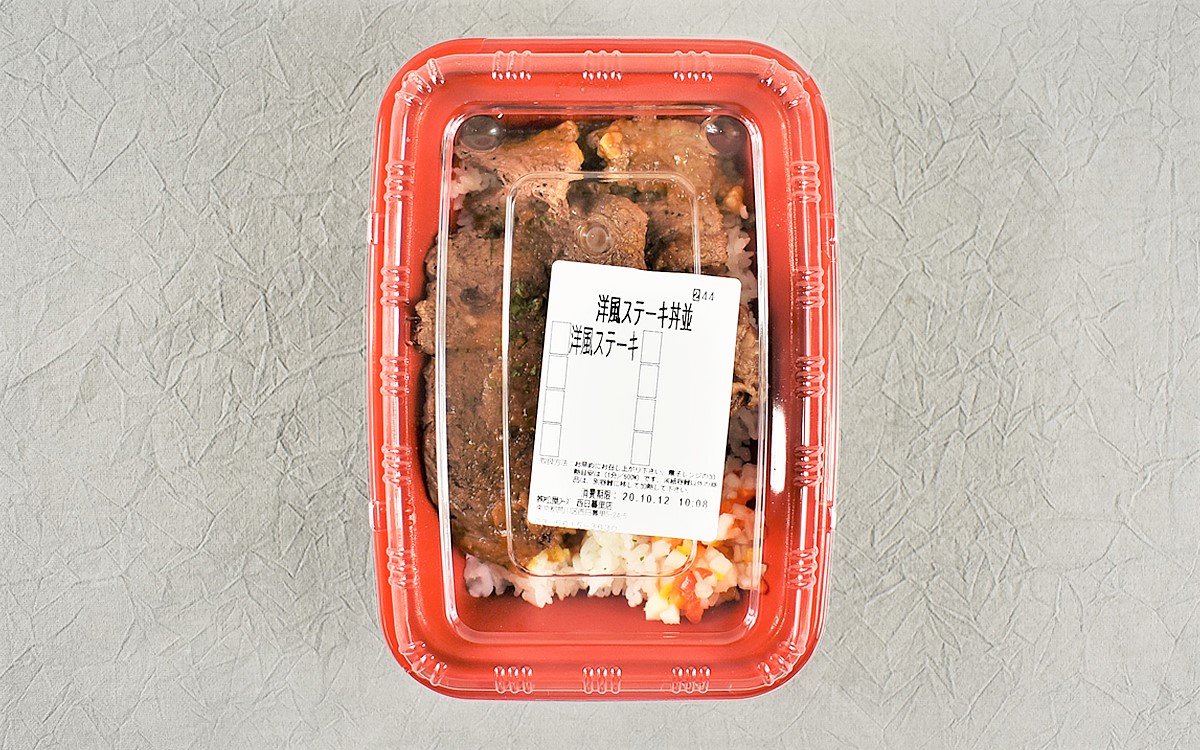 “選べる極旨ソース”が特徴の同商品。ソースの種類はガーリックの効いた“洋風”と、“和風”オリジナルソースの中から選択できます。今回は2種類のうち“洋風”をチョイスしましたが、フタを閉じていてもどこからともなく“にんにく”の香りが……。にんにく好きにもたまらない、コラボ弁当の全貌を明らかにしていきましょう。