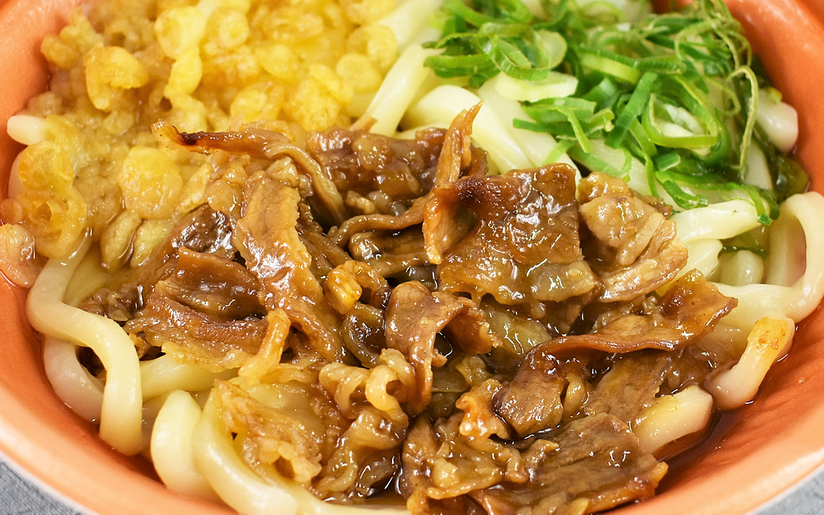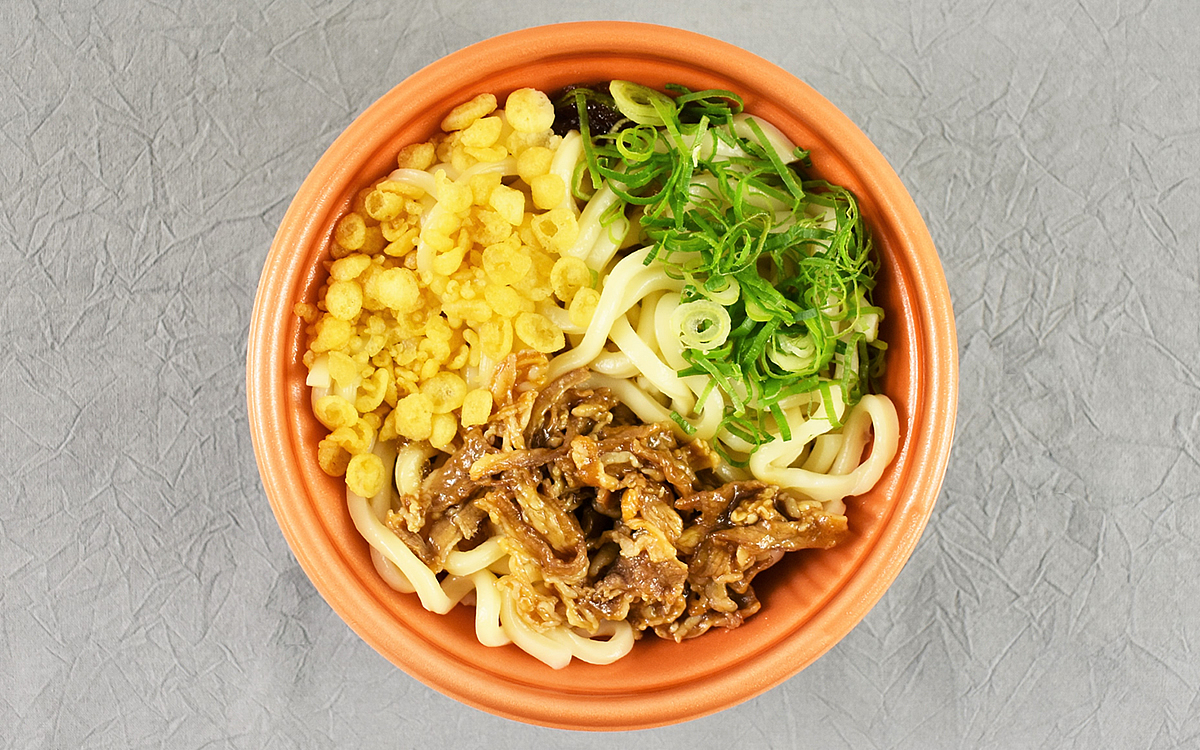 透明のパッケージからすでに具沢山な様子がうかがえる同商品。うどんの上には、牛肉炒めや揚げ玉、ねぎがたっぷりトッピングされています。別添えで「七味」も付属されているので、よりおいしく刺激的な辛さへ“味変”も可能。SNS上でも「甘めの牛肉炒め×出汁の効いたつゆが相性バツグン」など好評のコメントが続出しました。