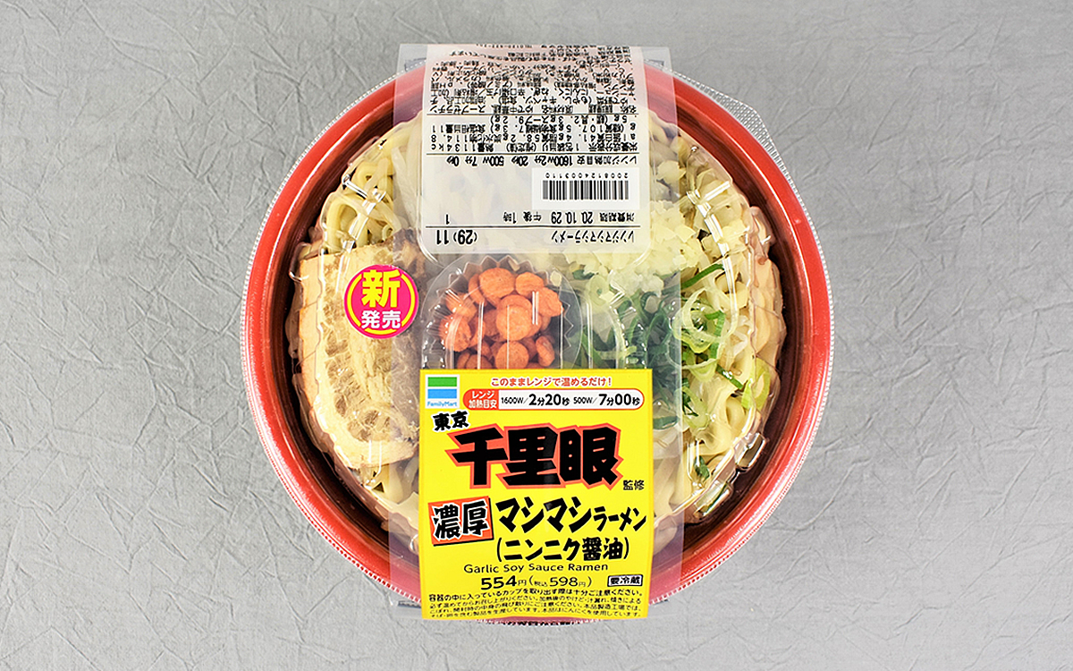 東京都・駒場にお店を構える人気ラーメン店「千里眼」。二郎インスパイア系としても知られる超有名店です。今回ご紹介する「千里眼監修 濃厚マシマシラーメン(ニンニク醤油)」(598円/税込)は、同店とファミリーマートのコラボ商品。ボリュームにこだわった“マシマシメニュー”の実力を確かめていきましょう!