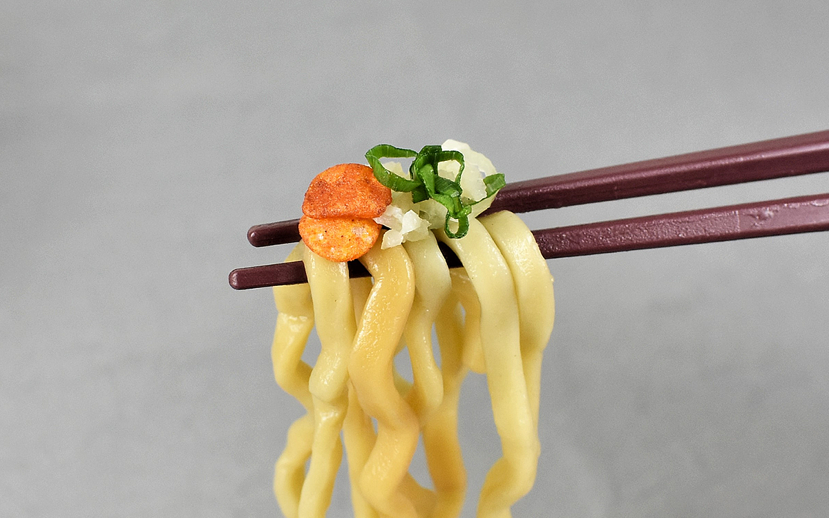 それではさっそく電子レンジで温めていきます。下の麺を上に返す、いわゆる“天地ガエシ”をしてから実食開始。まずは麺をすすってみたところ、弾力のある食感を楽しめました。麺は迫力のあるちぢれ太麺を使用しており、コシが強く食べごたえもバツグン。にんにくが効いたスープともよく絡み、絶品の味わいです。