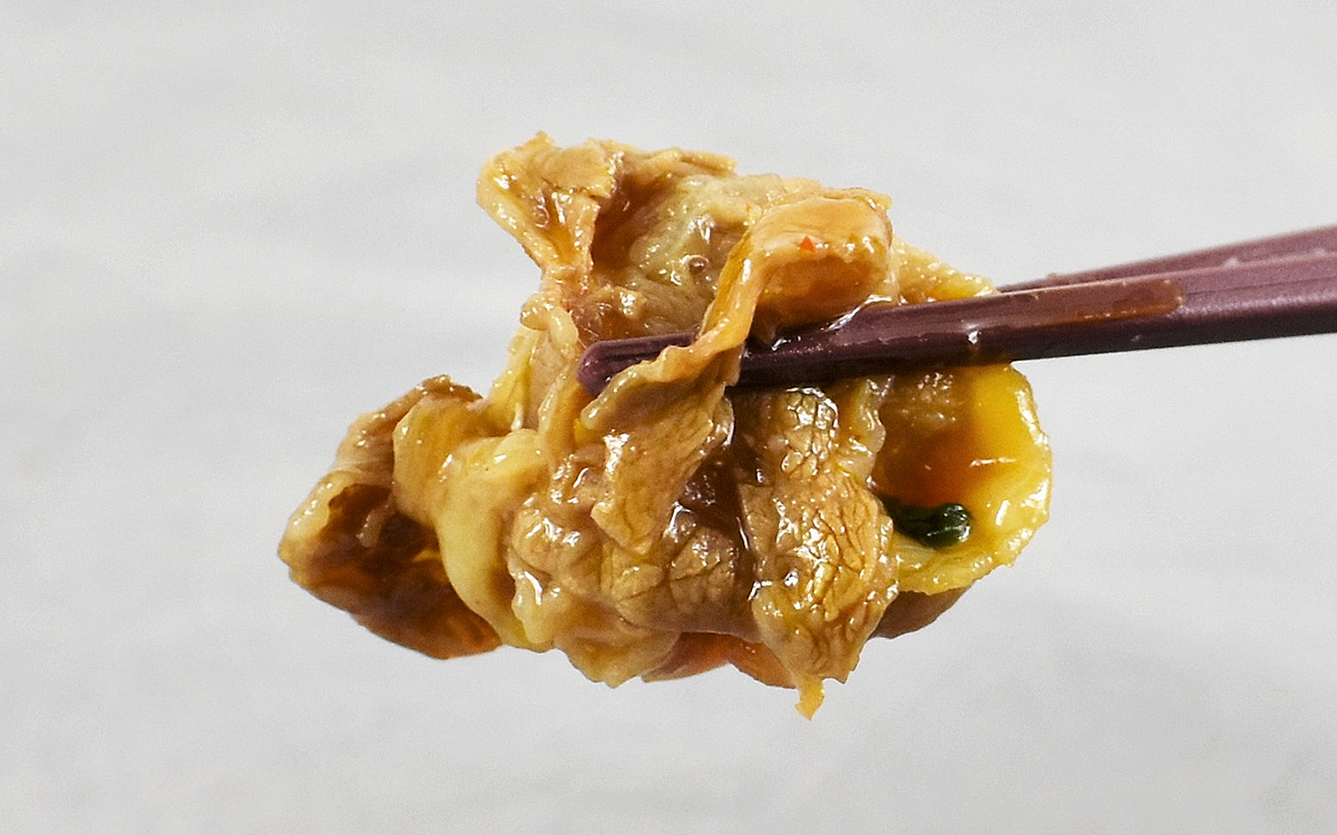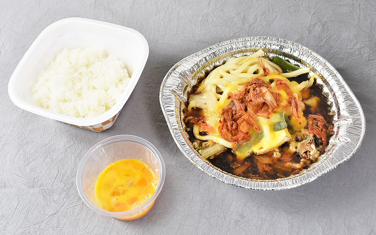 お肉と野菜が「これでもか!」というほどたっぷり入った同商品。具材の上にはキムチとチーズが惜しみなくトッピングされています。卵はなんと2個付属。“すき焼き風”にして溶き卵にお肉をくぐらせるもよし、はたまたシメの牛すき鍋に“卵とじ”することも可能です。