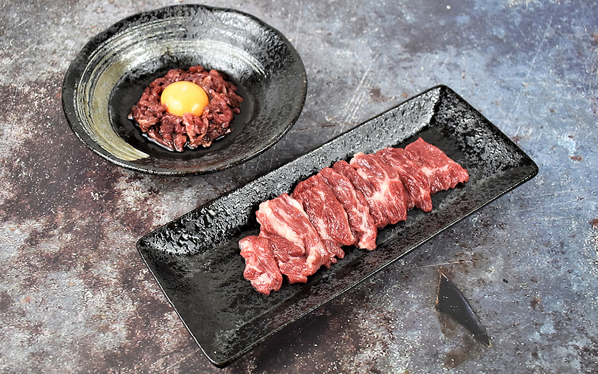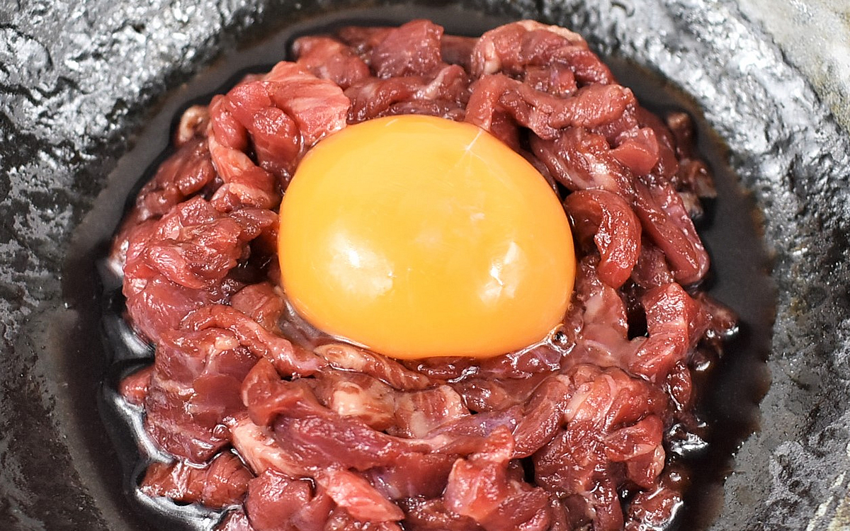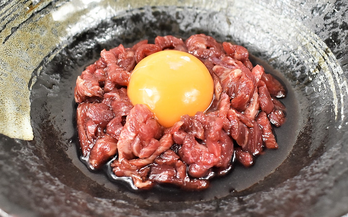 続いてふじ馬刺しのユッケをいただきましょう。食感は上赤身と異なり、柔らかくもコリコリとした噛みごたえ。付属のユッケのたれを加えるのはもちろん、卵黄もトッピングするのがおすすめです。馬肉のコクがさらに引き出されるので、お酒好きにはたまらない“肴”になりますよ。