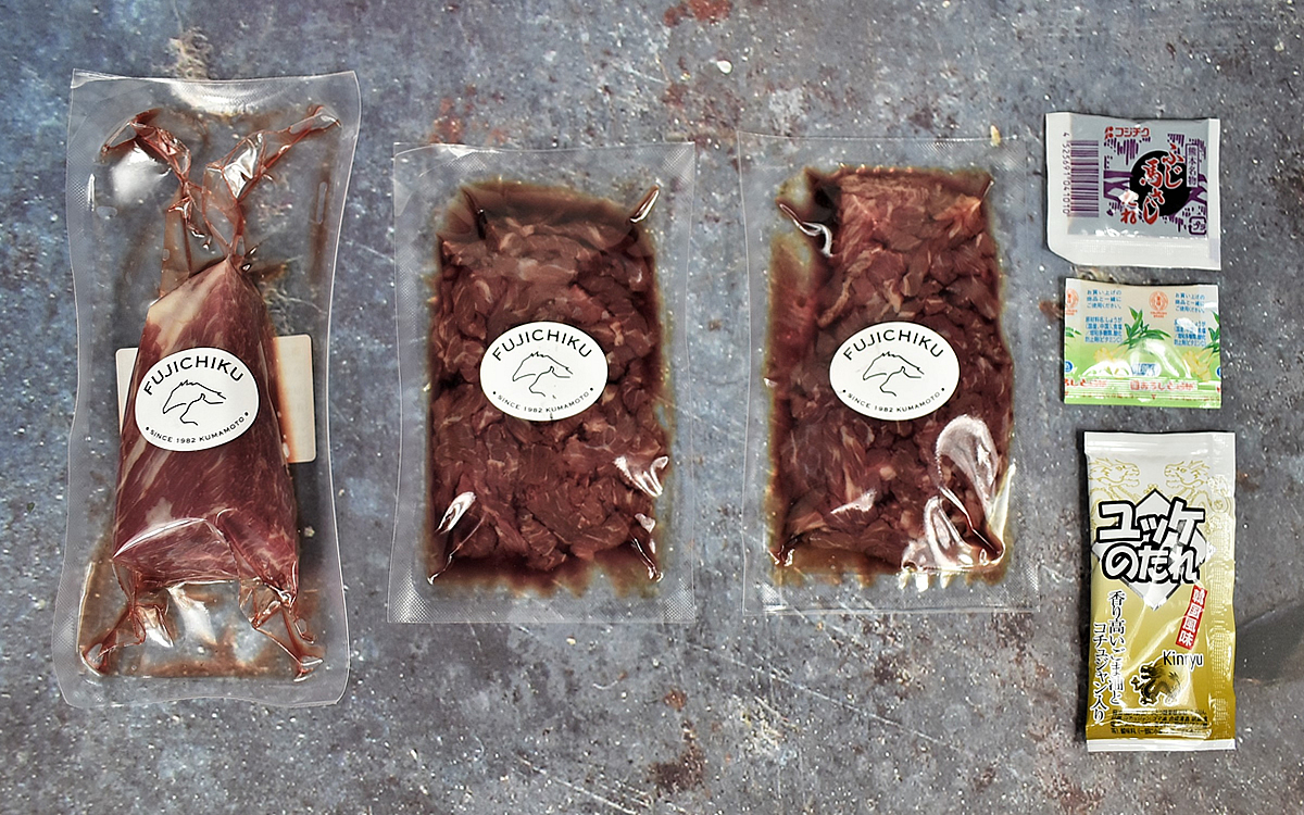 「ふじ馬刺しおためしセット」のセット内容は、ふじ馬刺し上赤身100gとふじ馬刺しのユッケ50g×2パック(専用たれ・おろし生姜つき)。パックはずっしりとした重みがあり、とても“お試し用”とは思えません。
