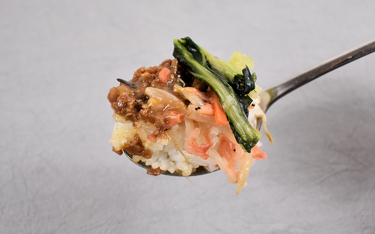 種類豊富な具材をご飯に重ねると、食べきれるか不安を感じるようなボリューム感にびっくり。風味豊かな豆板醤の香りもさることながら、彩り豊かな見映えにますます食欲をそそられます。