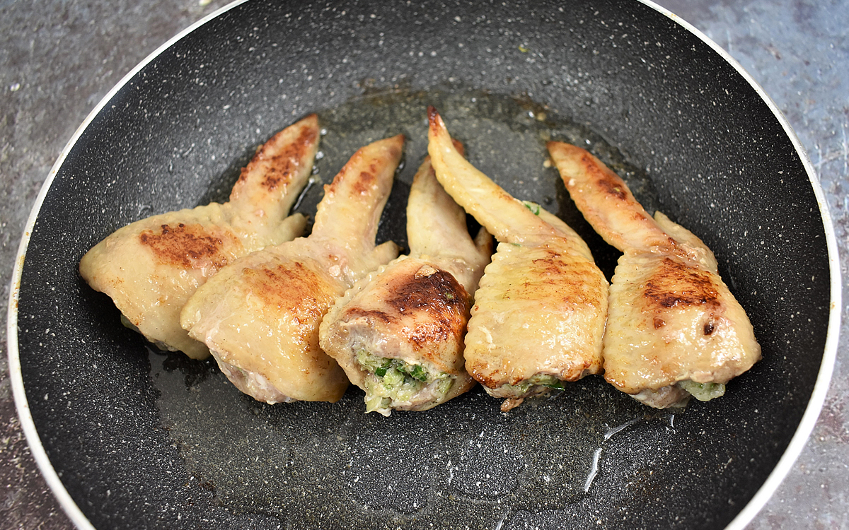 手羽先の選別から手作業でおこなわれるほど、多くのこだわりがつめ込まれた同商品。冷凍状態の手羽先をフライパンで蒸し焼きにしたところ、油が染み出した手羽の表面はツヤツヤに……。ぷにぷにの弾力からも、ジューシーな食感を十分に予感させてくれます。