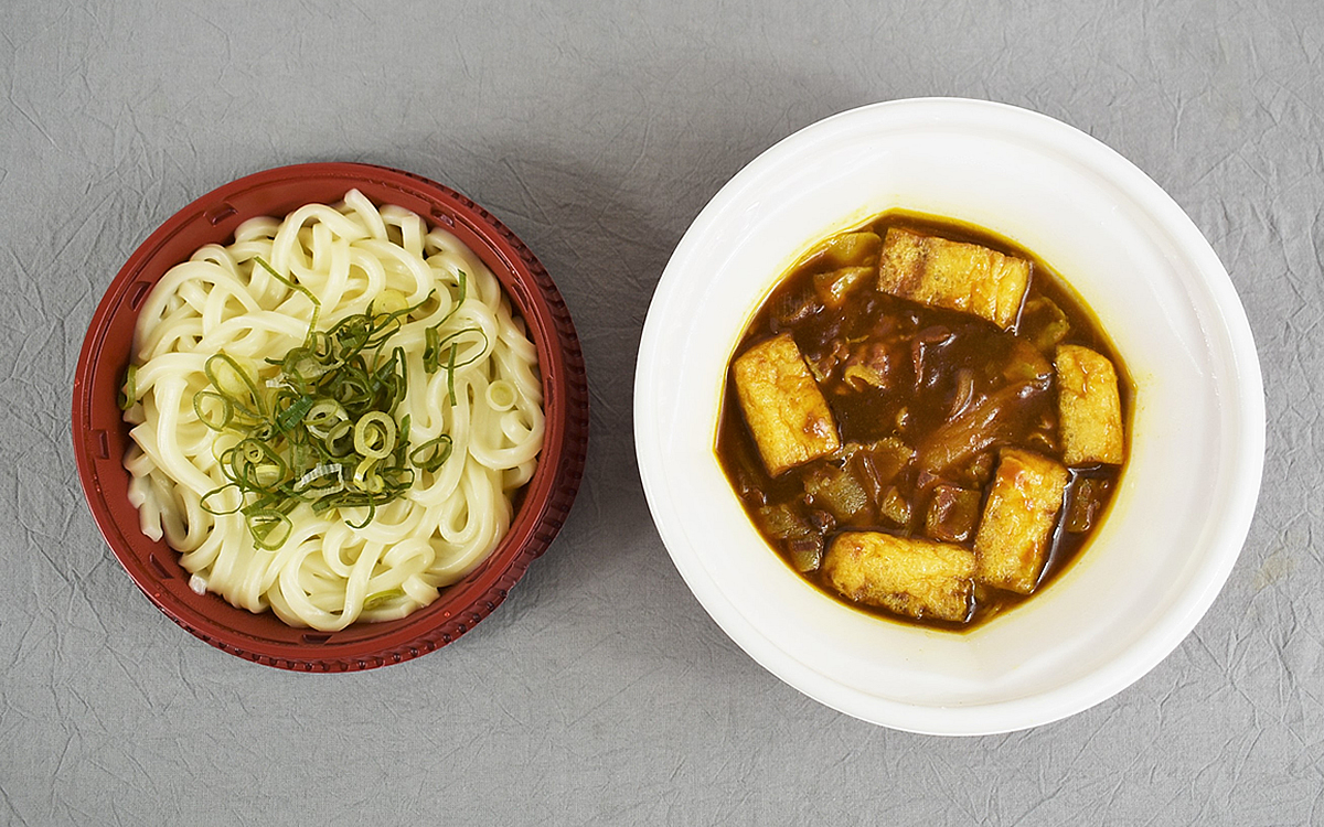うどんとネギ、カレースープと具材がそれぞれ分けられた同商品。ツヤツヤしたうどんの量もさることながら、豚肉やふっくらしたお揚げがたくさんトッピングされているのもうれしいですよね。
