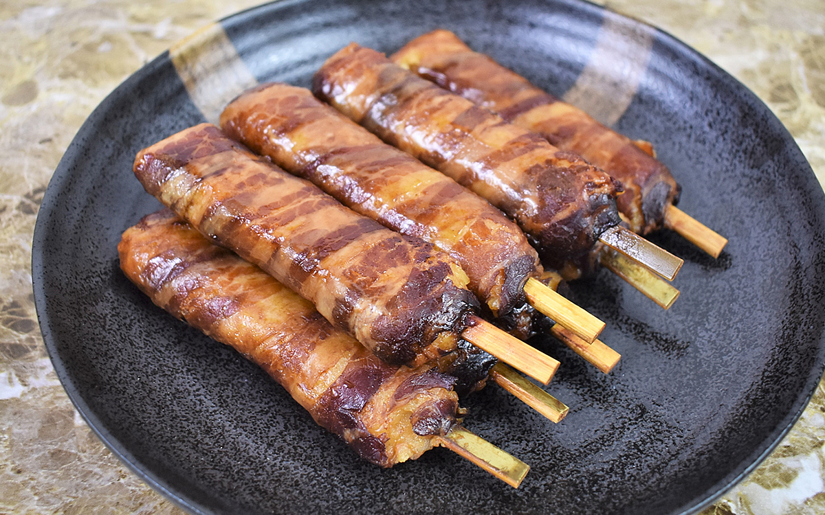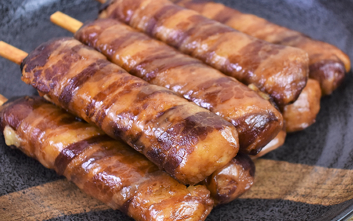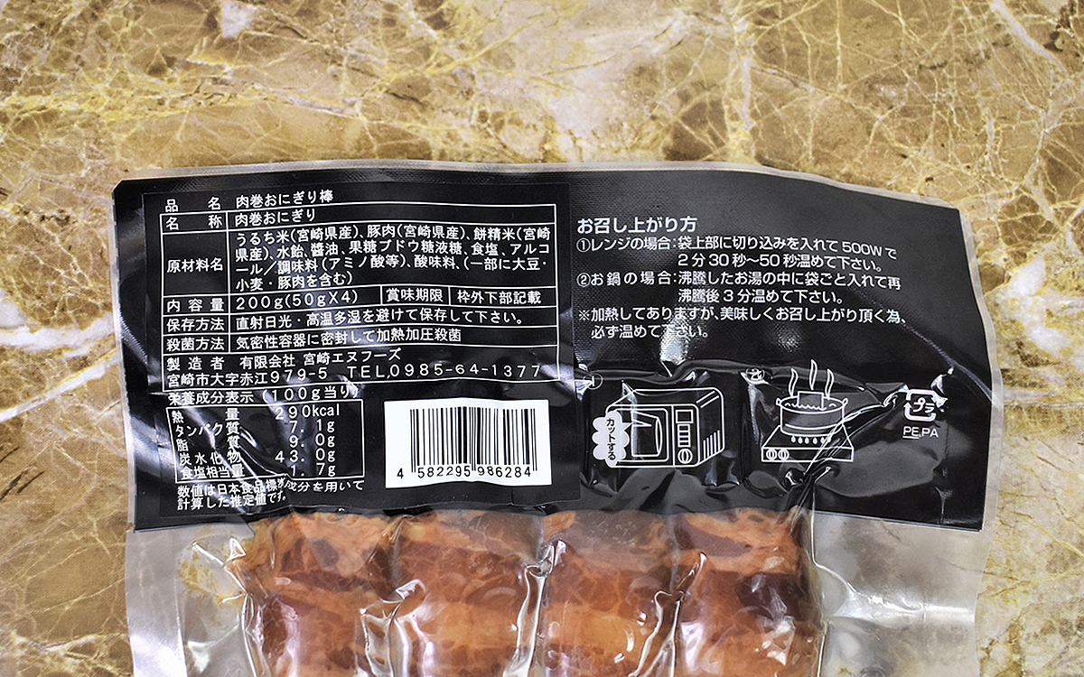 そんな宮崎名物を小さくスティック状にした「肉巻きおにぎり棒」。豚肉が表面をしっかり覆い尽くしているため、やはりそのビジュアルからはおにぎりとは思えません……。