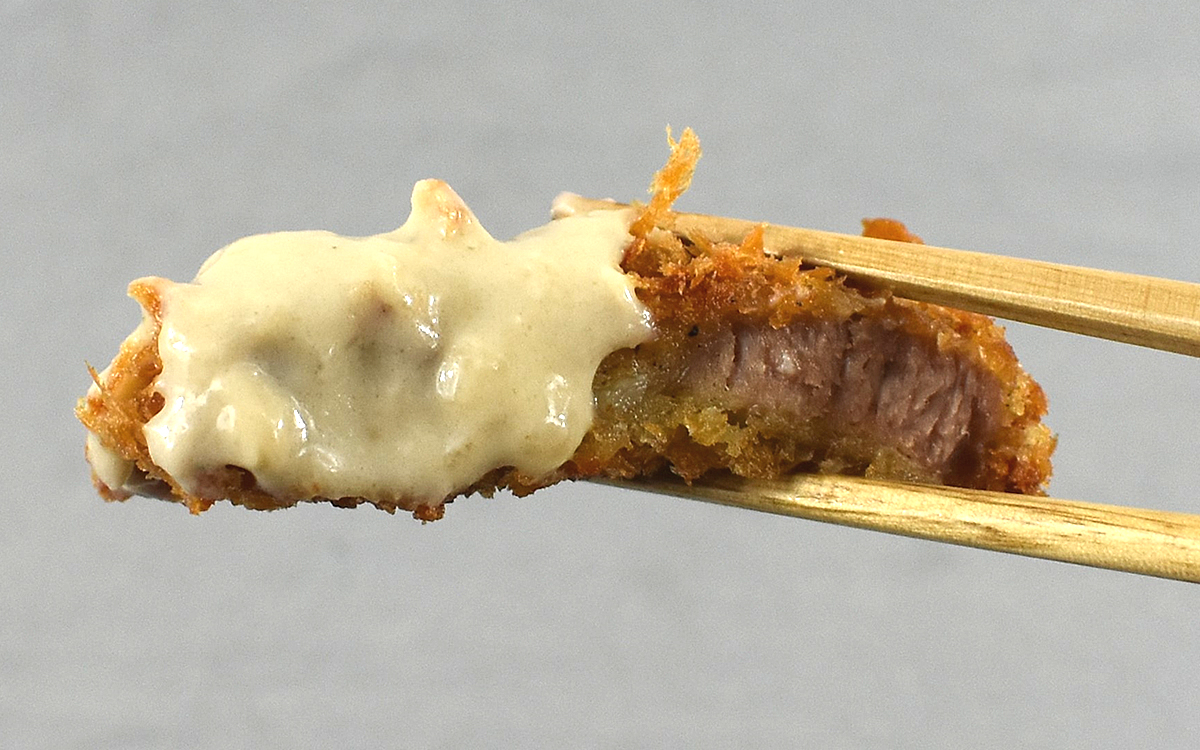 さっそくホワイトソースと一緒にとんかつをいただくと、まず驚いたのが予想を超えたにんにくの味わい。見た目からは想像もつかないほど豊かなにんにくの香りが口の中いっぱいに広がりました。そしてにんにくの風味は、シルキーで繊細な味とも絶妙にマッチ。程よく塩気も効いており、一層食欲をそそられますよ。