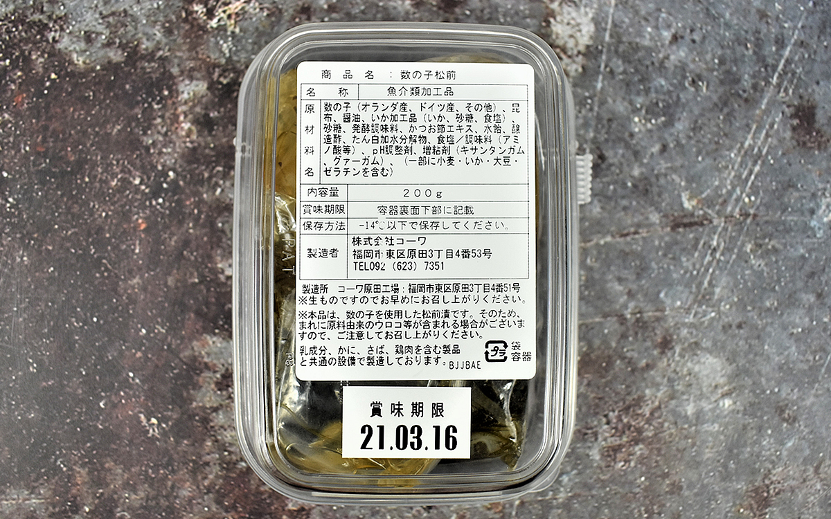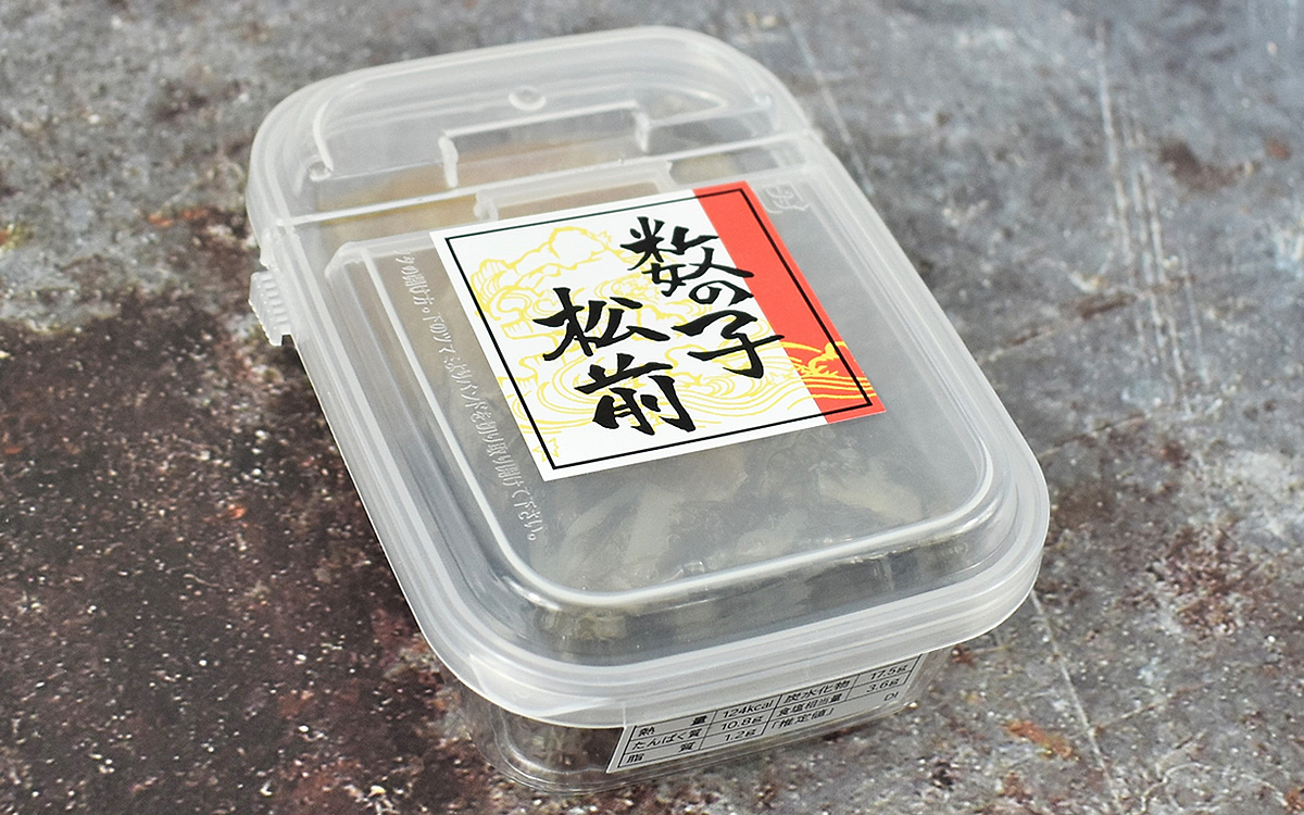 同商品の名前に含まれている松前とは、北海道の郷土料理“松前漬け”のこと。数の子とともにイカと昆布を醬油漬けにした料理で、それぞれの歯ごたえやトロリとした食感を楽しむことができます。ちなみにニシンの魚卵を「数の子」と呼ぶ理由は諸説ありますが、北海道から東北にかけてニシンを“カド”と呼んでいたことが語源だとか。またニシンに「二親」と漢字を当て、父と母からたくさんの子が生まれるという考えが縁起の由来につながったようです。