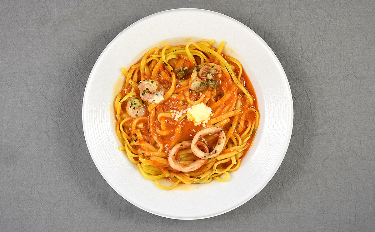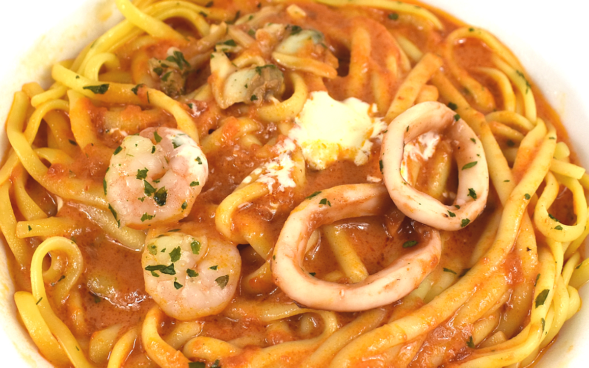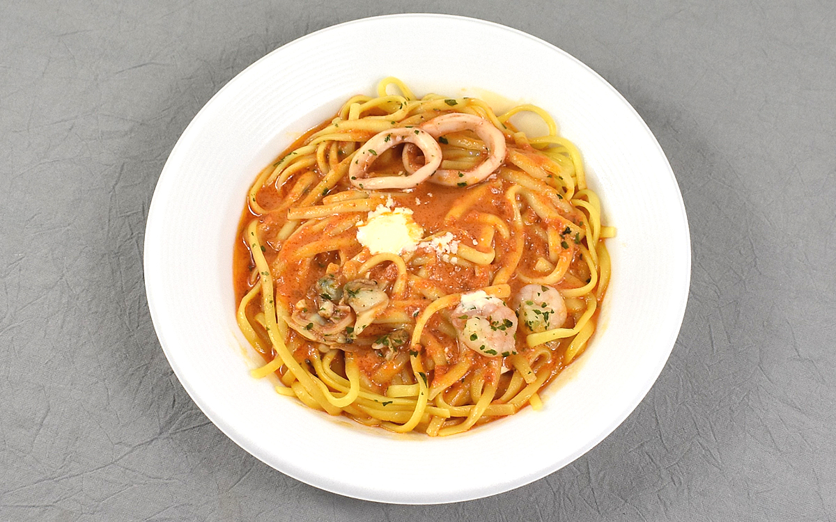 さっそくパスタをいただいてみると、トマトクリームソースの旨みで口の中がいっぱいに。海老・イカ・あさりの味わいも加わるため、あっという間に地中海風の奥深い香りが広がっていきます。またリングイネの歯ごたえもしっかり弾力があり、噛めば噛むほど楽しめる独特の食感がたまりません。